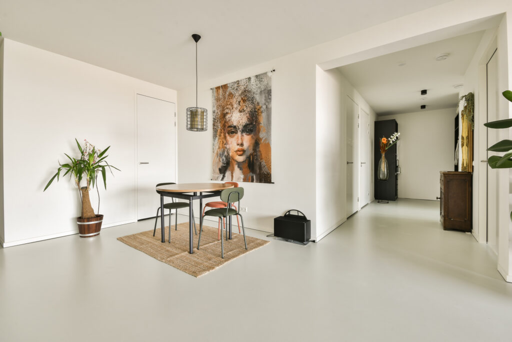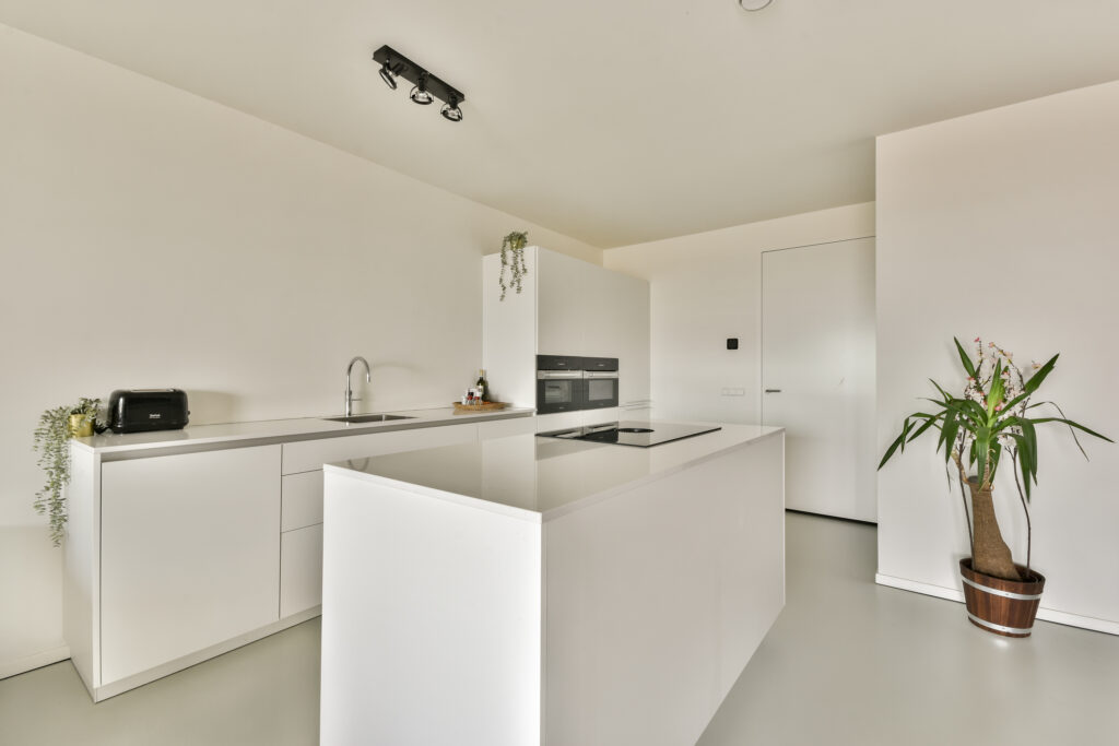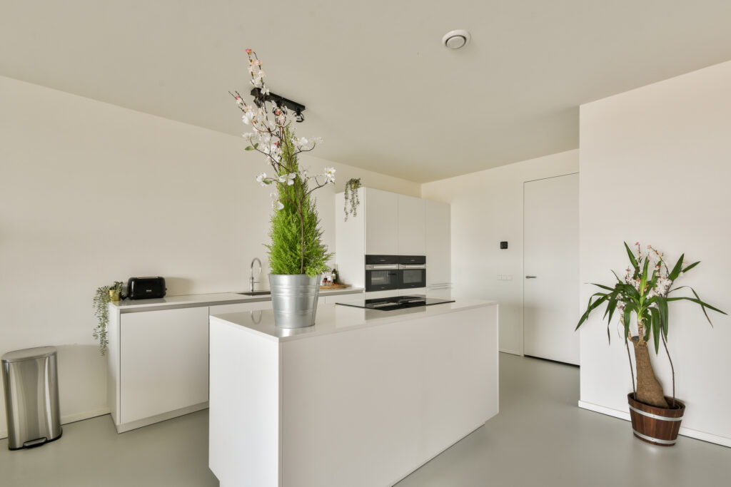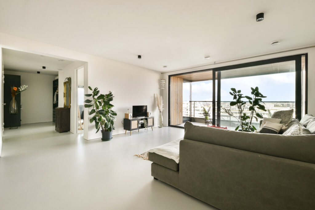 De woonkamer is royaal en licht, met verdiepingshoge ramen en een schuifpui naar het terras op het noordwesten. Hier geniet je van prachtige vergezichten en spectaculaire zonsondergangen. De open Poggenpohl keuken met kookeiland is strak en greeploos afgewerkt en voorzien van inbouwapparatuur van Miele/AEG, waaronder een koelkast, vriezer, oven, combi-oven, vaatwasser, Quooker en geïntegreerde afzuiging.