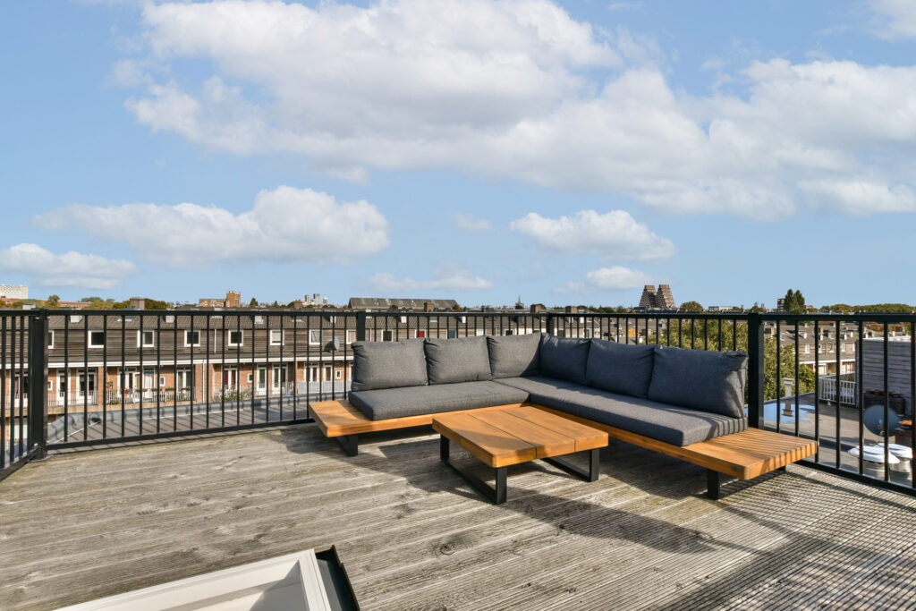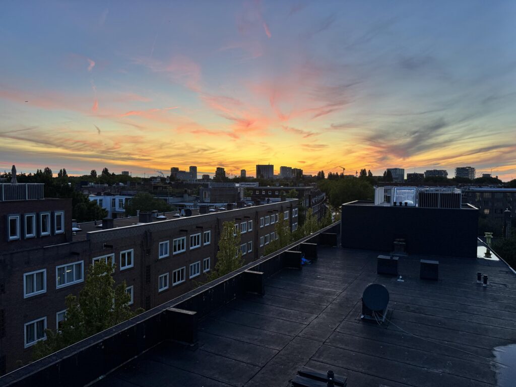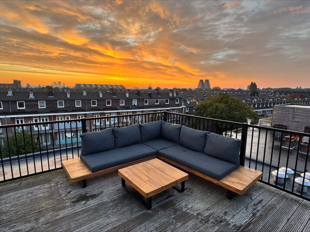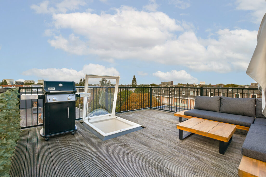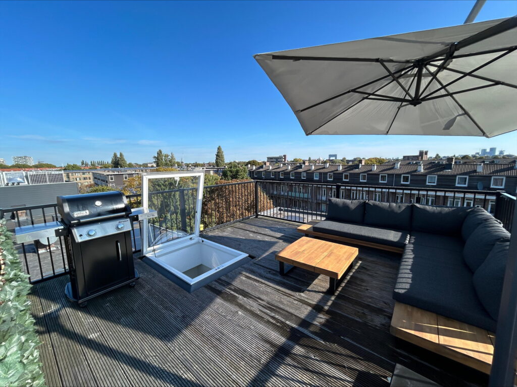 The fixed staircase leads to the ultimate highlight of this property: a wonderfully sunny roof terrace. Here you can enjoy the sun all day long and take in spectacular views over Amsterdam. A perfect place to relax and unwind.