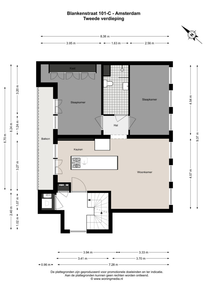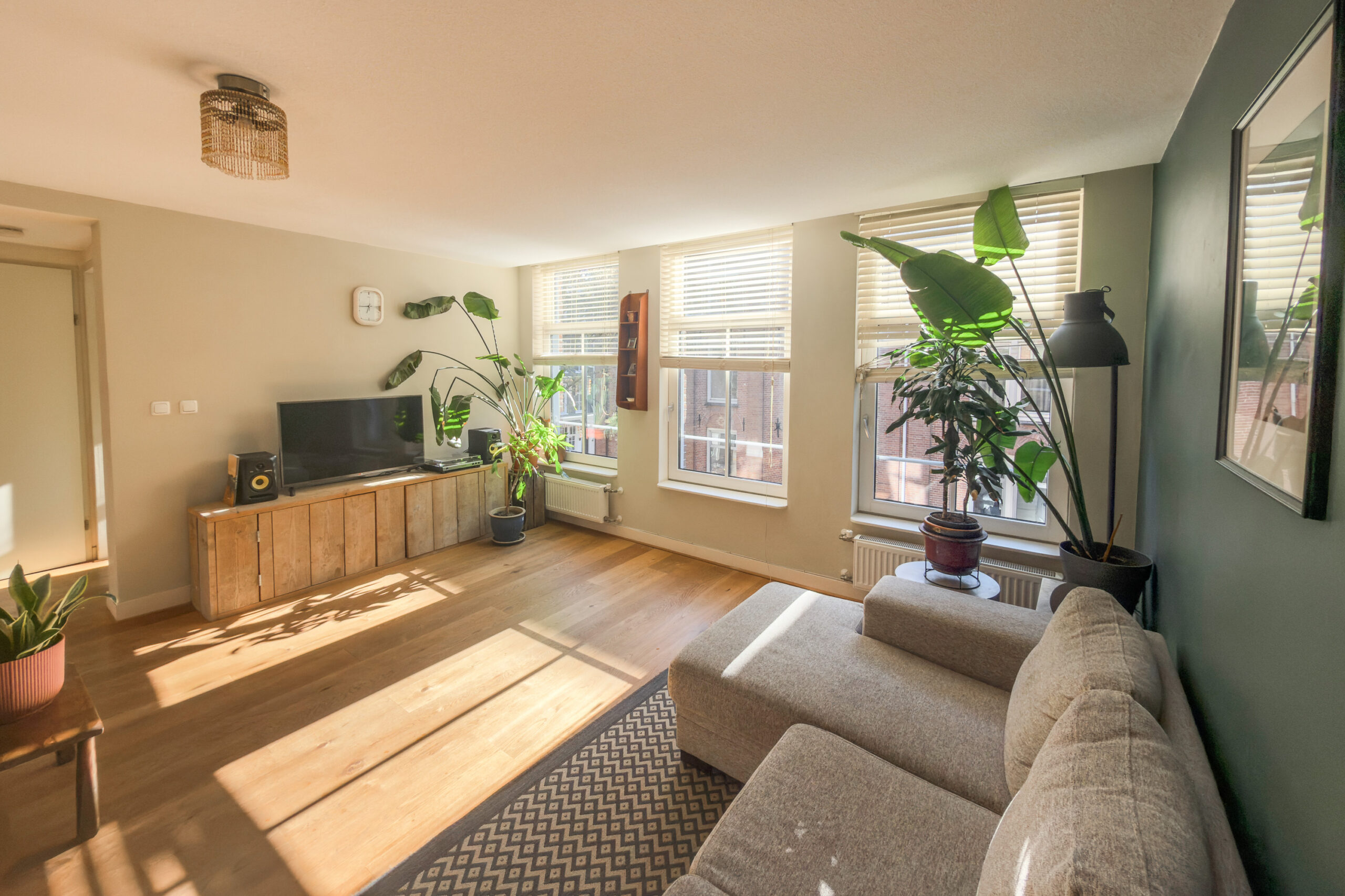 Via de gezamenlijke entree bereik je de woning, gelegen op de tweede verdieping van het appartementencomplex. Je komt binnen in de lichte woonkamer met open keuken, voorzien van een houten vloer en een grote raampartij. De keuken is uitgerust met een wijnkoeler, vaatwasser, combi oven-magnetron en een koel-vriescombinatie. Vanuit de keuken is er toegang tot het brede balkon op het noordwesten. Vanuit de woonkamer zijn de twee slaapkamers en de badkamer bereikbaar. Slaapkamer één is gelegen aan de voorzijde en wordt momenteel gebruikt als eetkamer, maar kan desgewenst ook uitstekend dienen als slaapkamer. De tweede, ruime slaapkamer bevindt zich aan de achterzijde en biedt voldoende ruimte voor een grote kast en geeft tevens toegang tot het balkon. De inpandige badkamer is voorzien van een toilet, wastafel en douche. In het trappenhuis bevindt zich een kast met de aansluiting voor de wasmachine en de meterkast. Op de zolderverdieping is een ruime berging van 8 m² met elektra en daglicht