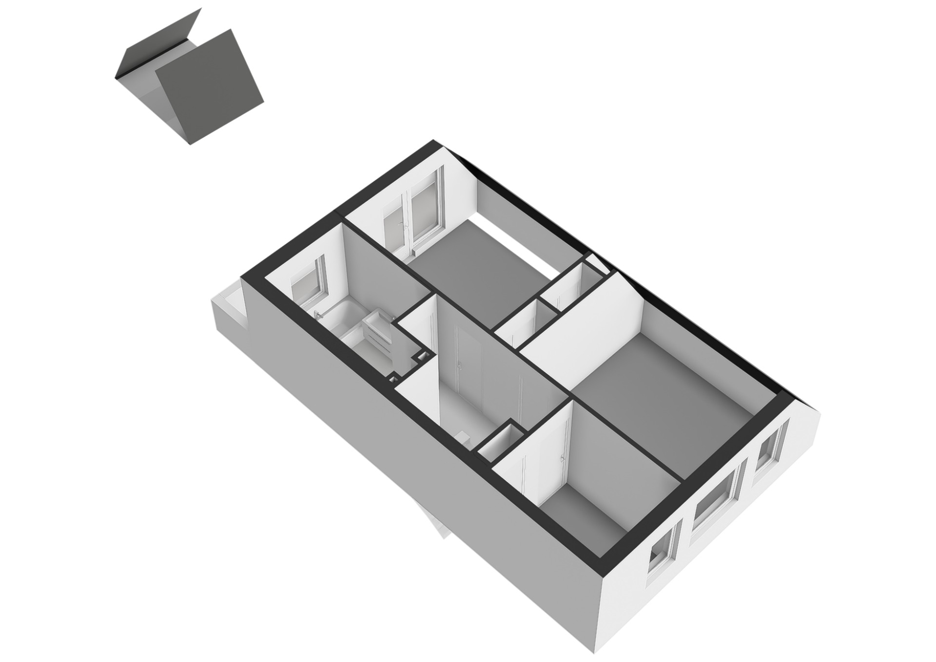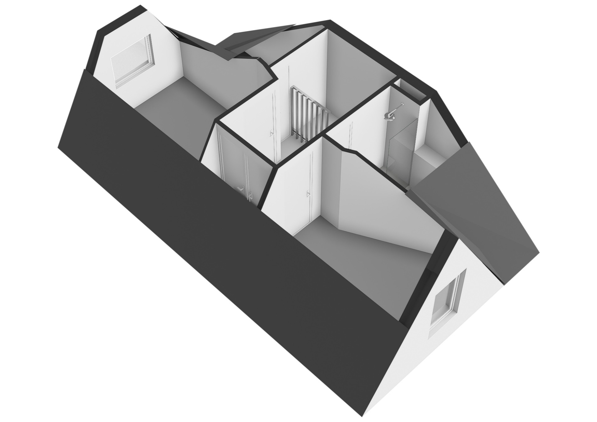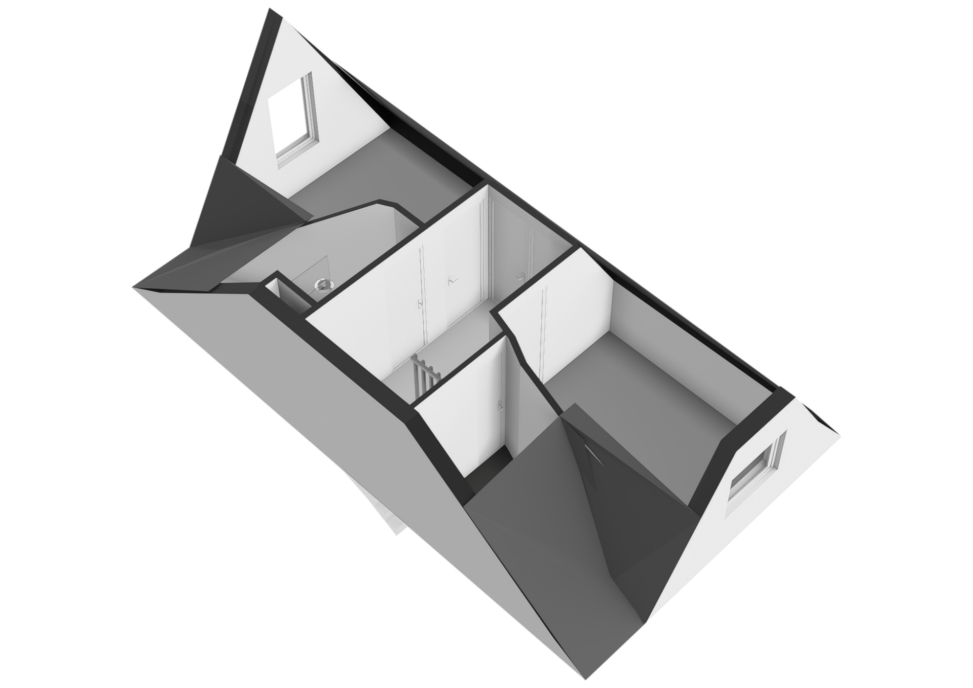 Zolderverdieping: De zolderverdieping is ingedeeld in twee slaapkamers, één aan de voorzijde en één aan de achterzijde. In het midden bevindt zich de tweede badkamer. De zolder is bereikbaar via een vaste trap.