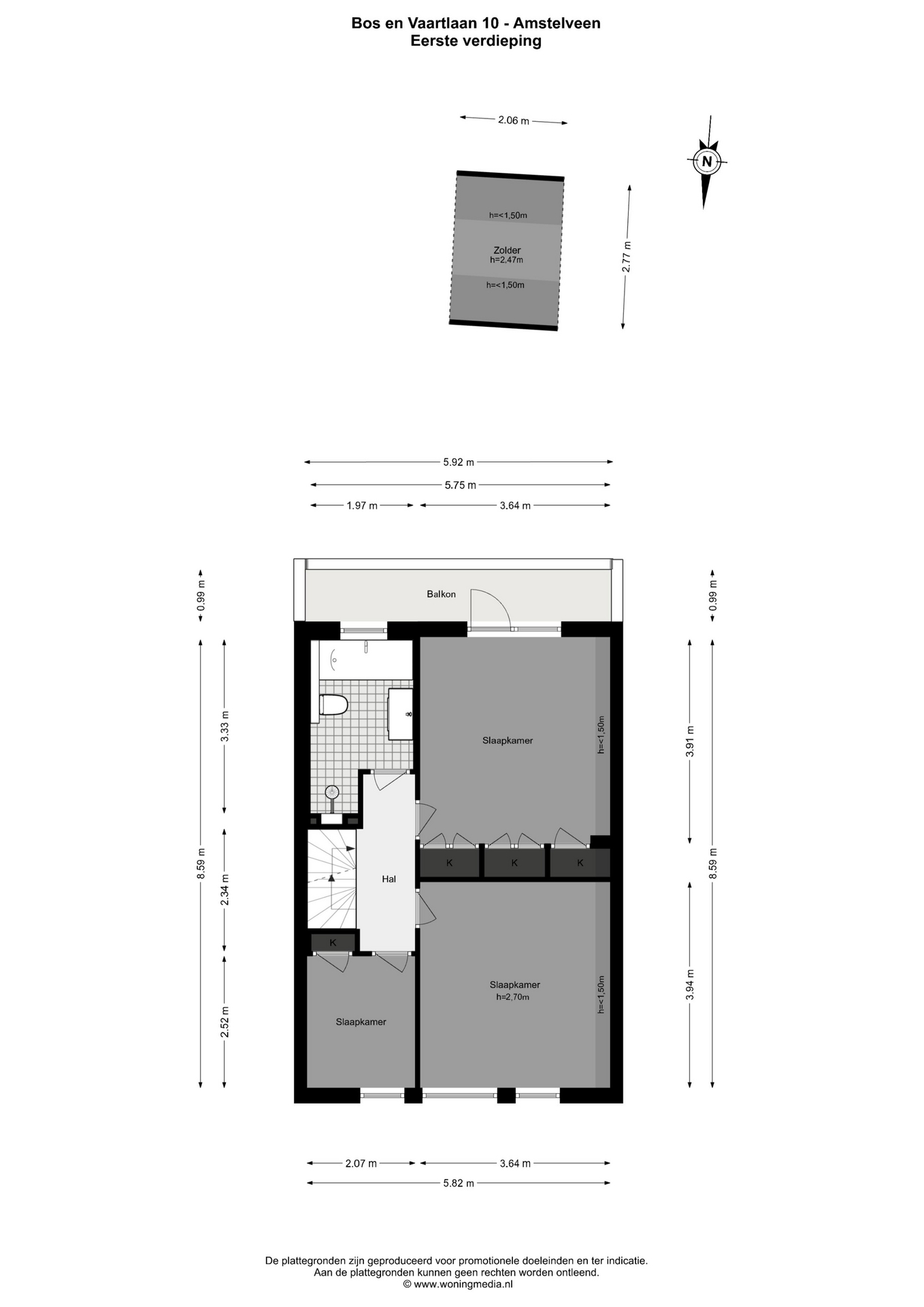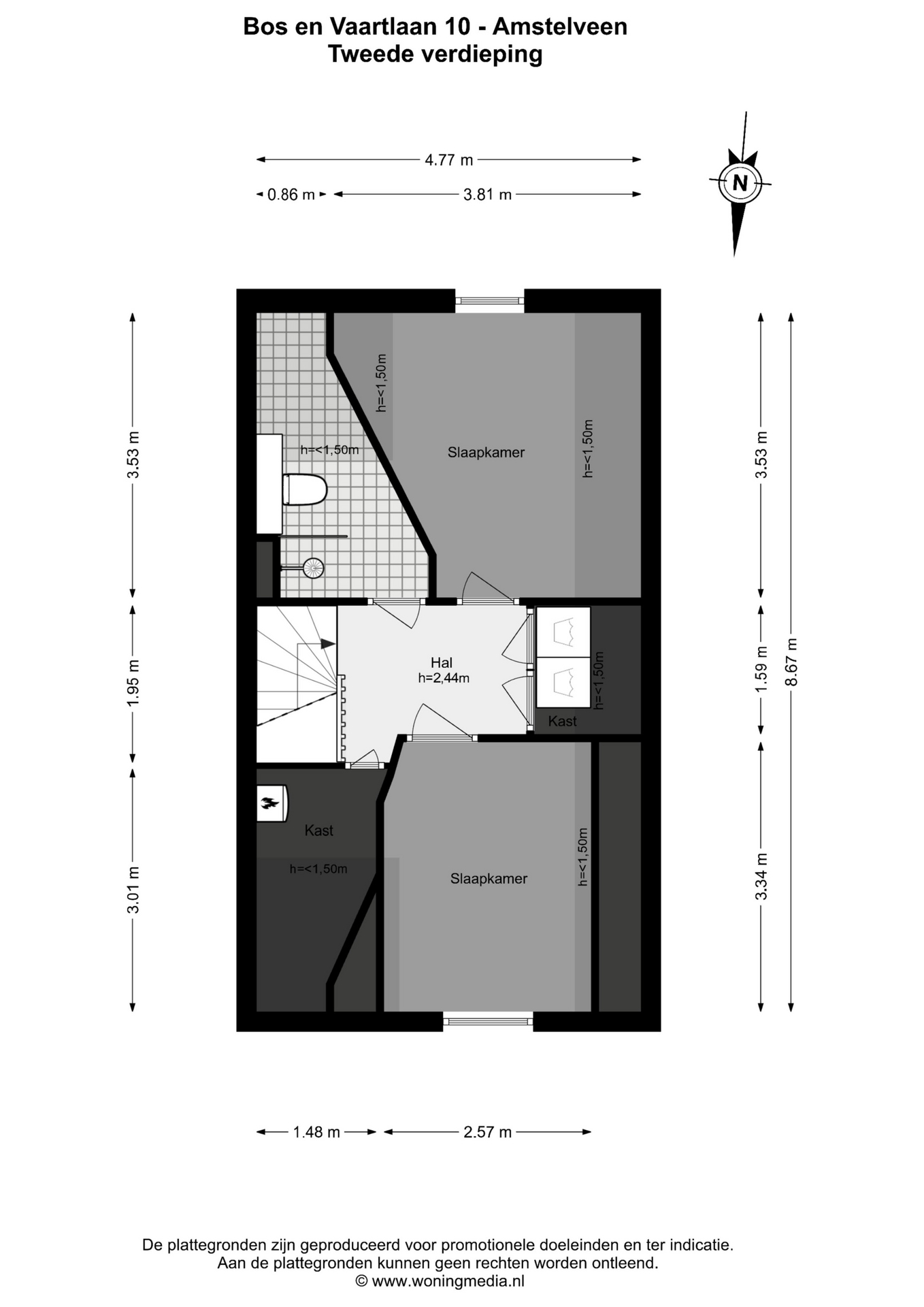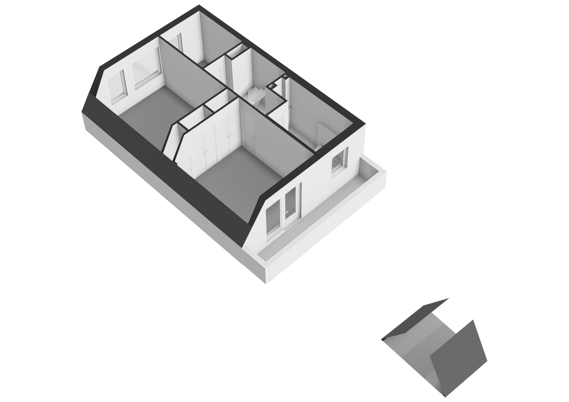 Zolderverdieping: De zolderverdieping is ingedeeld in twee slaapkamers, één aan de voorzijde en één aan de achterzijde. In het midden bevindt zich de tweede badkamer. De zolder is bereikbaar via een vaste trap.