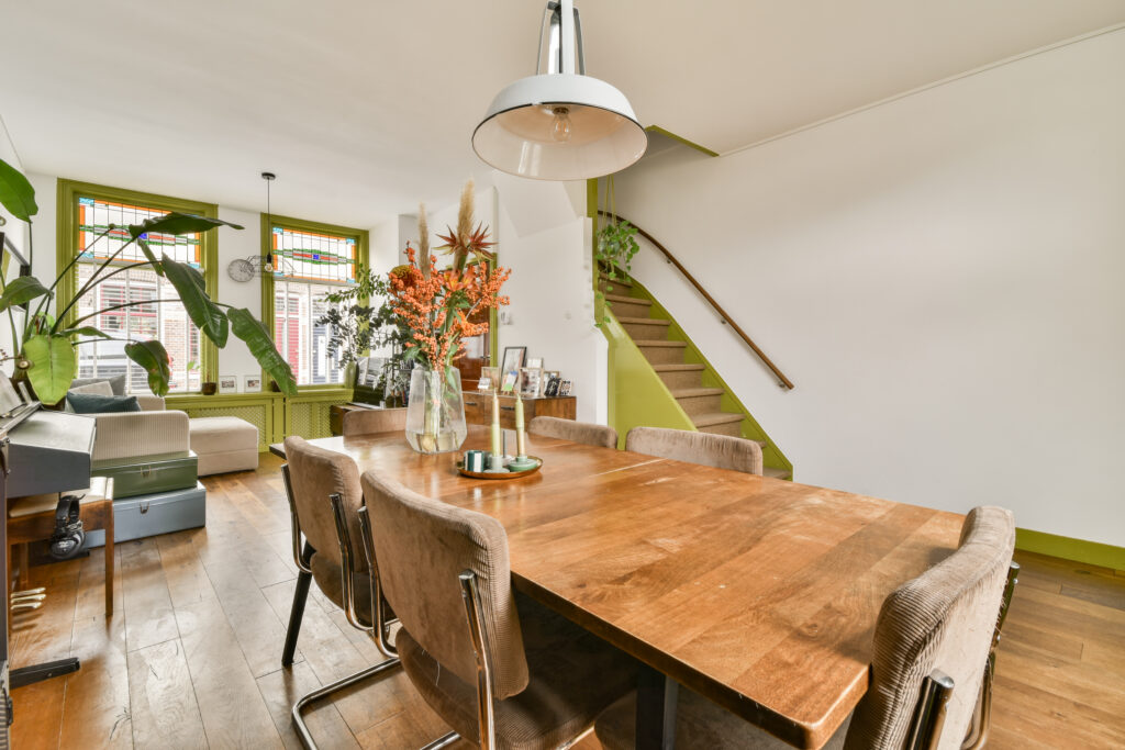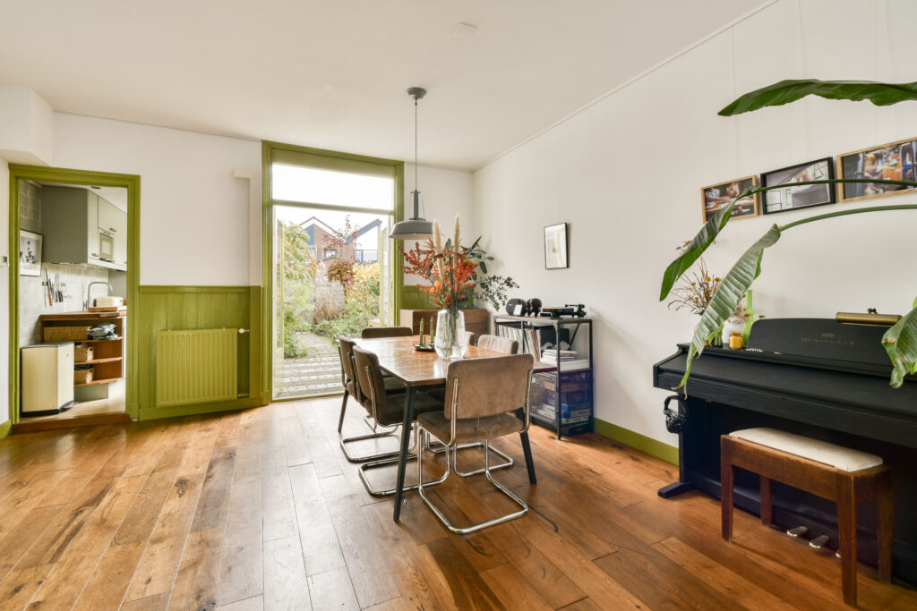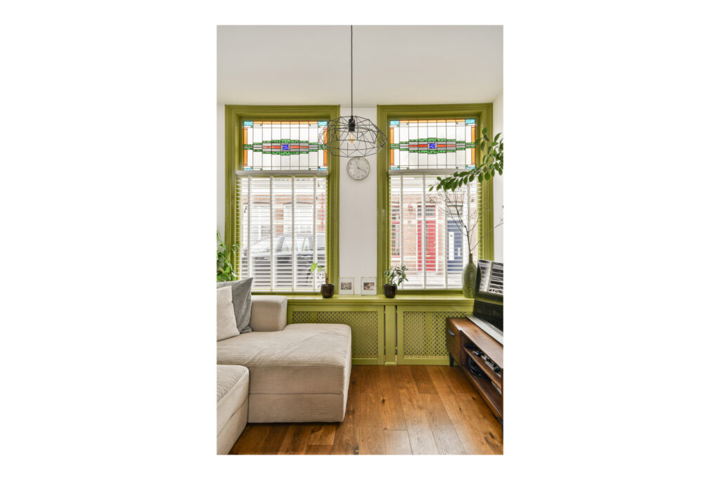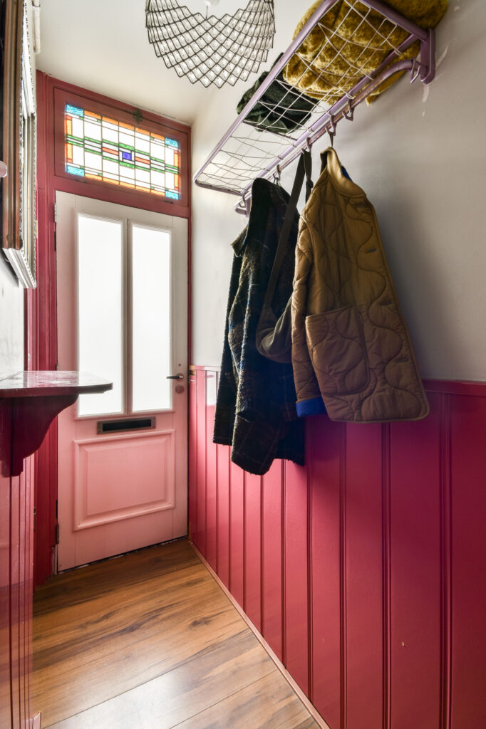 You enter through the hallway, which provides access to the toilet, living room and dining room. Large windows on both sides of the house create beautiful natural light, while the stained-glass details add extra charm. From the living room you can access both the kitchen and the garden.