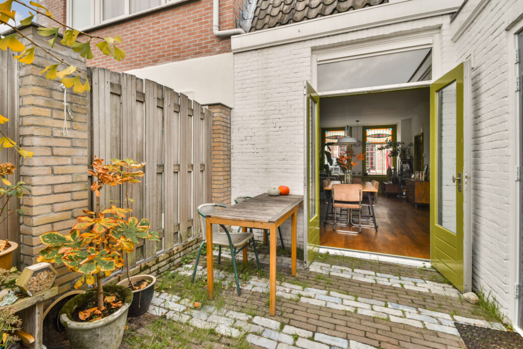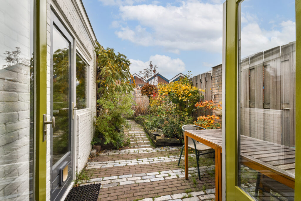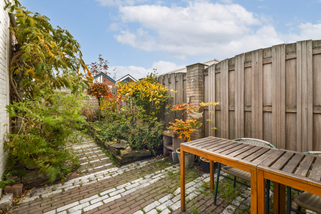 Aan het einde van de diepe tuin staat de aangebouwde berging, die ideaal is voor opslag van fietsen en gereedschap. Hier is ook de CV ketel (2023) te vinden.
