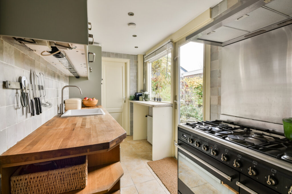 De keuken is uitgerust met diverse inbouwapparatuur, waaronder een oven en gasfornuis uit circa 2020. Aangrenzend bevindt zich de badkamer, met een moderne douche en nieuw wastafelmeubel.