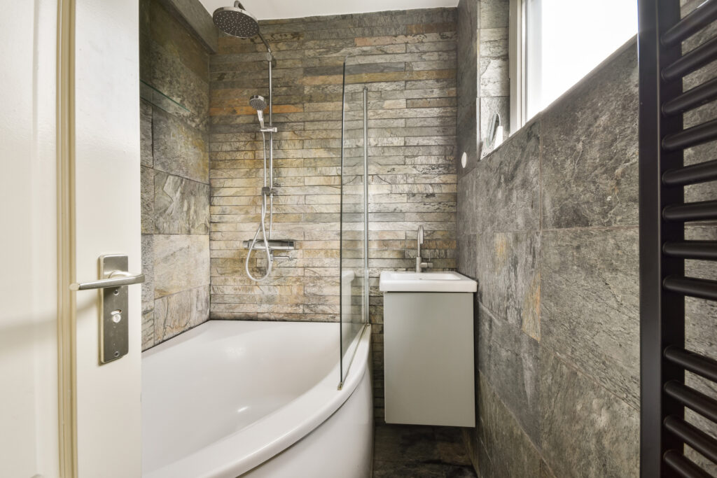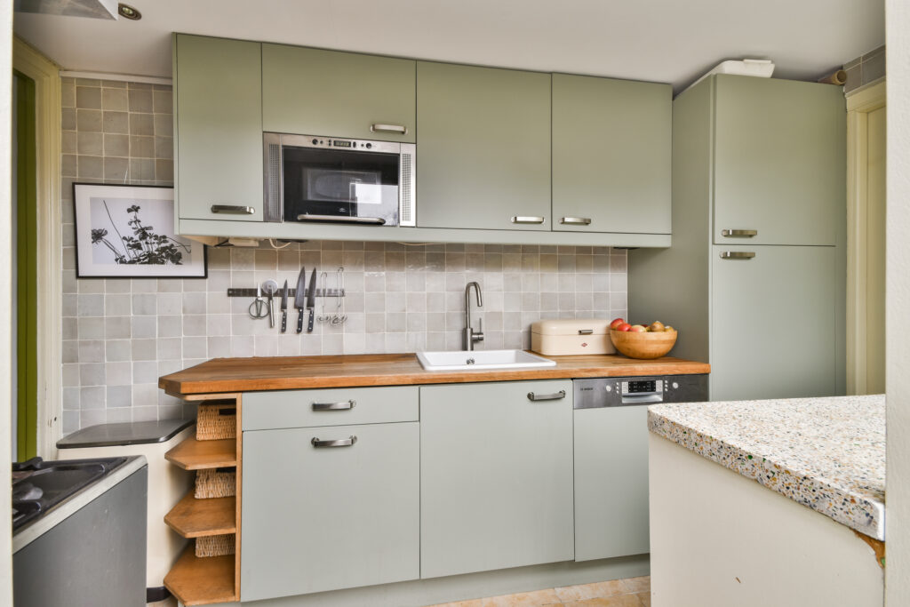 The kitchen is equipped with various built-in appliances, including an oven and gas stove from around 2020. Adjacent is the bathroom, fitted with a modern shower and a new washbasin cabinet.