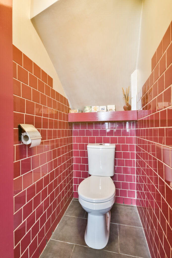 The first floor features three bedrooms. On the landing, a built-in cupboard provides extra storage space and houses the washing machine and dryer neatly out of sight. The charming main bedroom at the front has a west-facing window and is distinguished by its sloping ceiling and exposed beams, giving the space a warm and homely atmosphere.