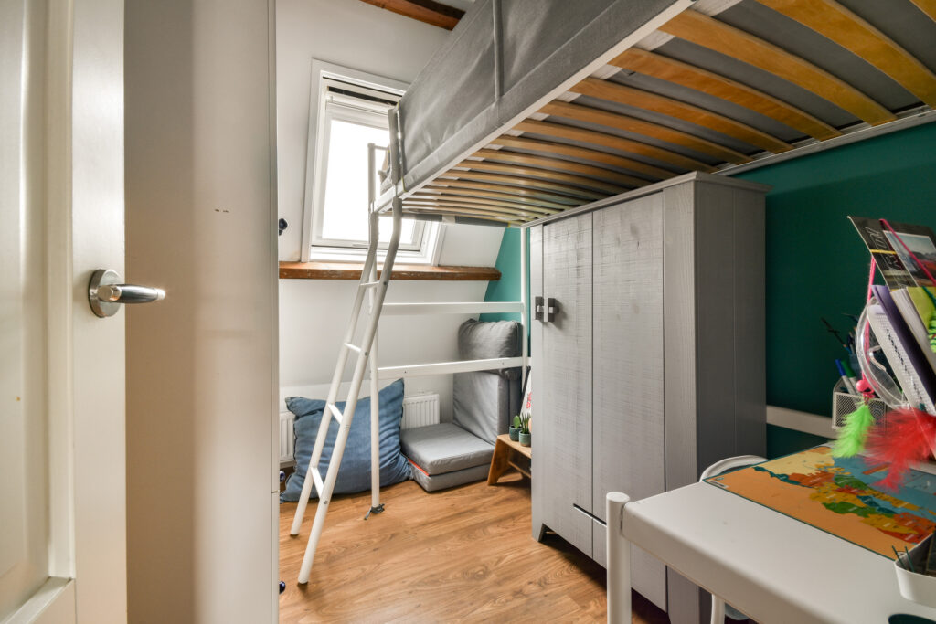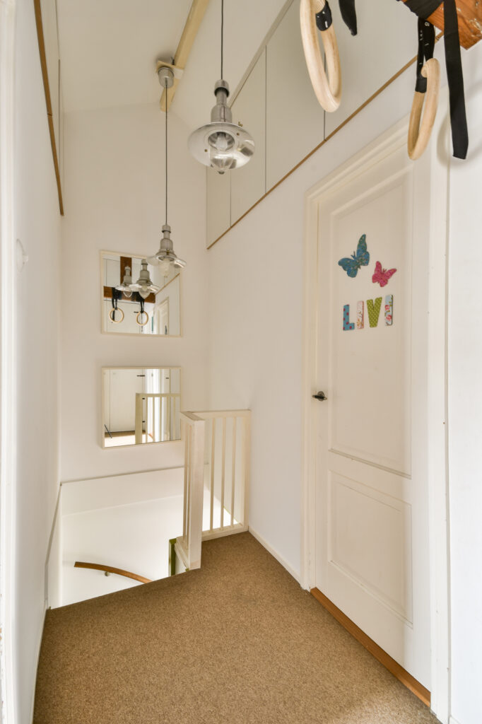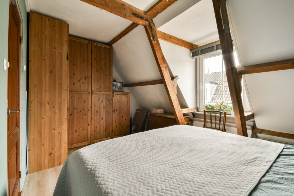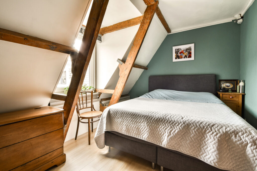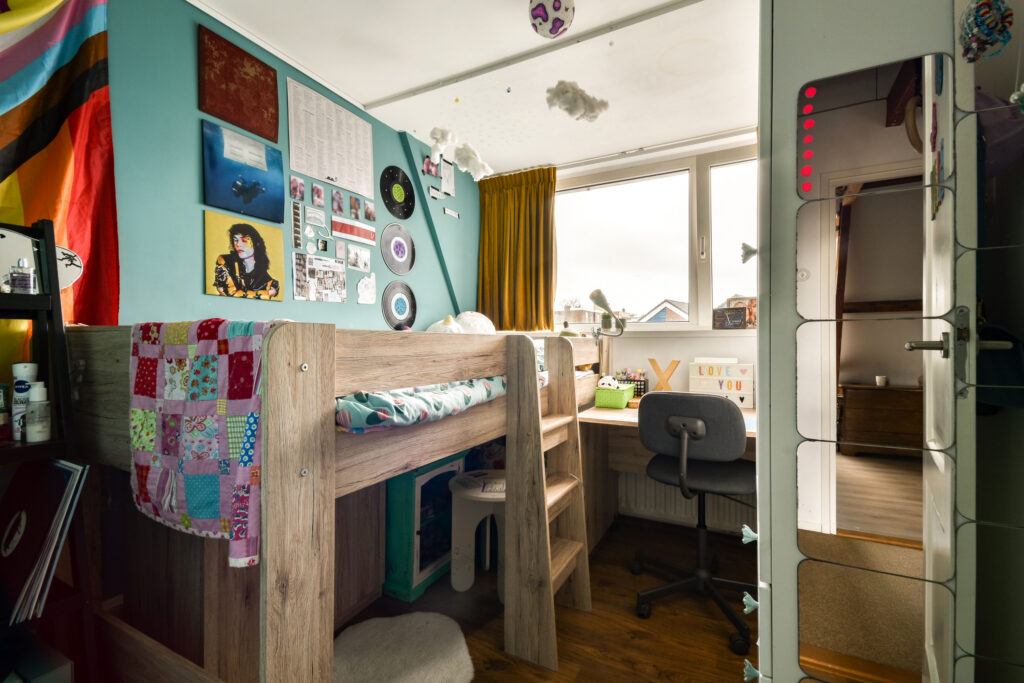 Op de eerste verdieping bevinden zich drie slaapkamers. In de overloop is een ingebouwde kast aanwezig voor extra opbergruimte, waar ook de wasmachine en droger uit het zicht in zijn geplaatst. De sfeervolle grote slaapkamer aan de voorzijde heeft een westelijk gericht raam en onderscheidt zich door het schuin aflopende dak en de zichtbare balken, wat de ruimte een warme en huiselijke uitstraling geeft.
