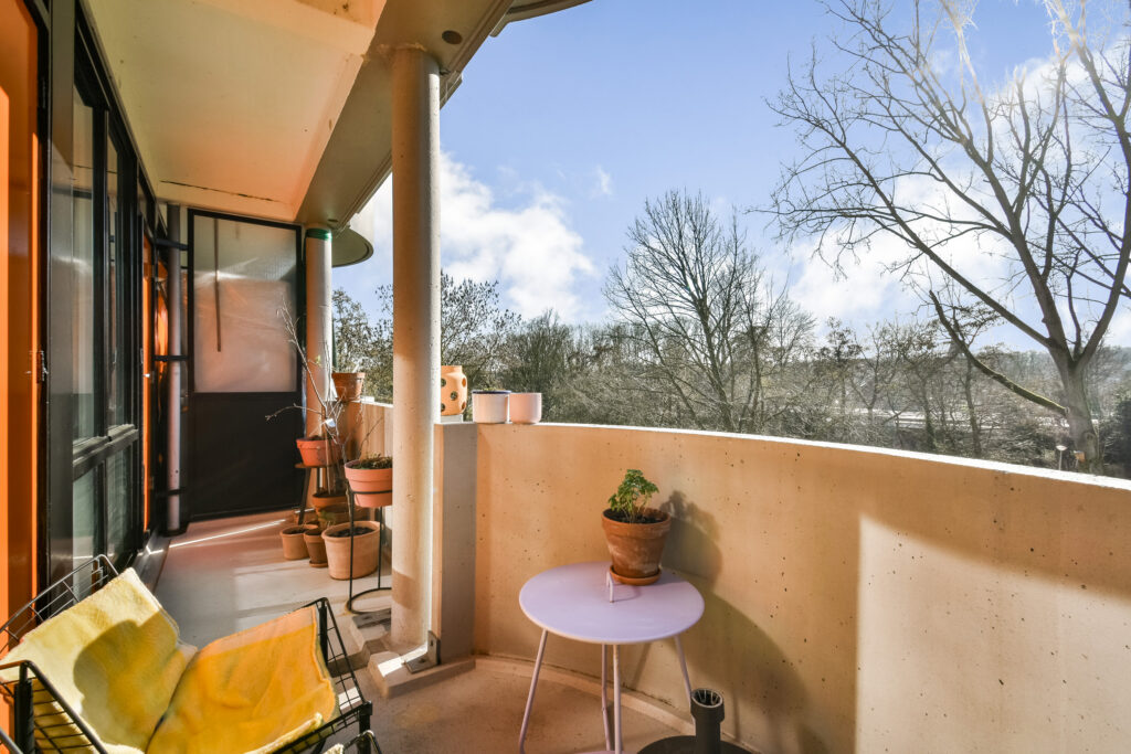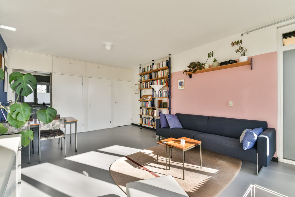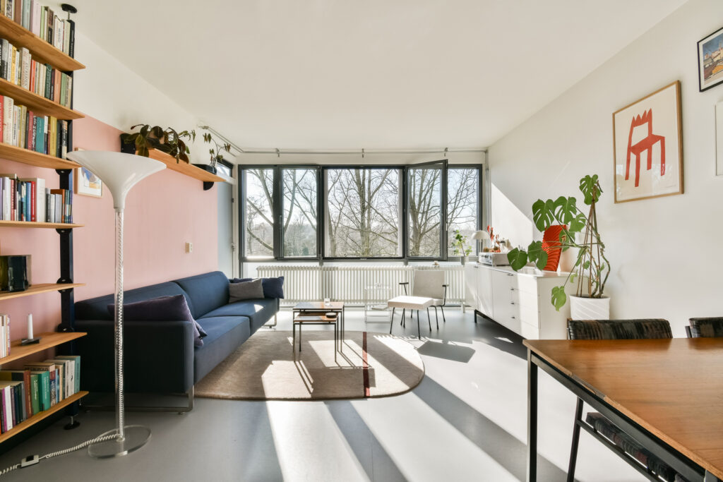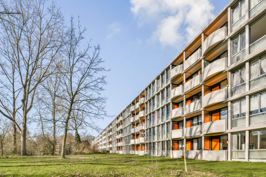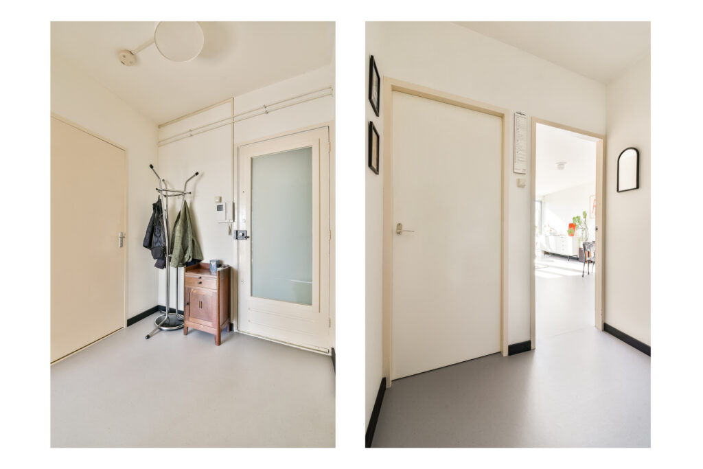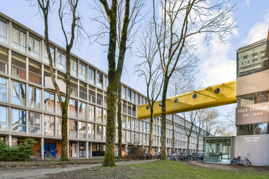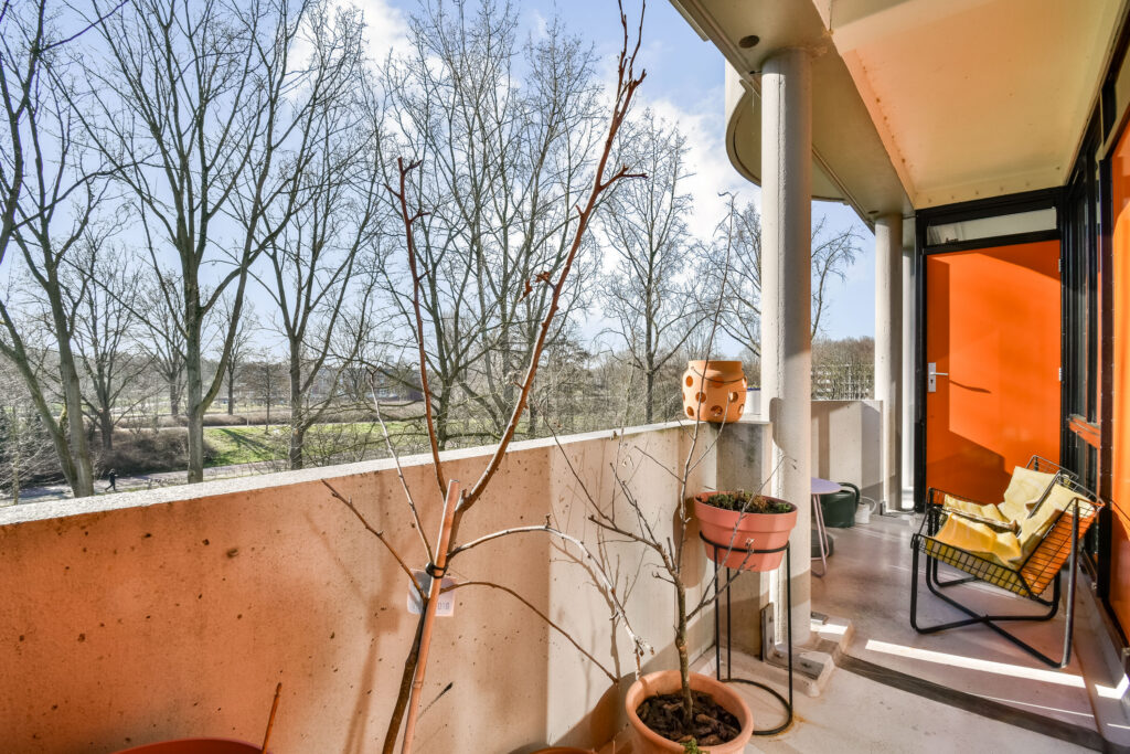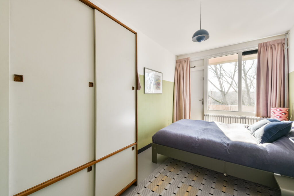 The apartment is located in the quiet and family-friendly neighborhood Het Breed in Buikslotermeer, a green and spacious residential area. The neighborhood is also known as Plan Van Gool, named after architect Frans van Gool. In 2024 it was designated as a municipal protected cityscape due to its innovative urban design and futuristic architecture. The residential blocks are connected by elevated walkways, which together with the internal galleries on the third floor create an additional route through the neighborhood, the so-called “streets in the sky”.
