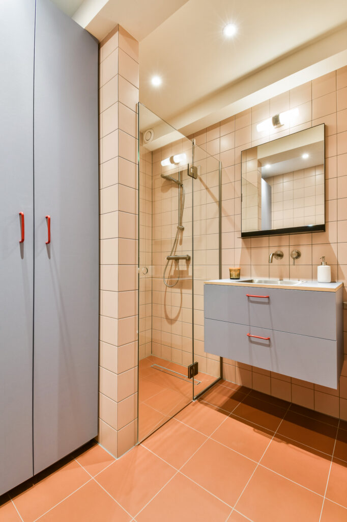 The bathroom was completely renovated last year and has a modern finish. It features a walk-in shower, washbasin cabinet and a practical built-in cupboard where the washing machine is neatly concealed. Everything has been finished to a high standard.