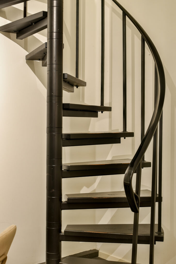 First floor: Upon entering, you step into the spacious living room with a wardrobe closet on the left side with enough space for your coat. The room has a high ceiling, a large window with French doors to the private courtyard where the private parking lot is located. On the right corner next to the spiral staircase to the basement is the toilet with a sink.