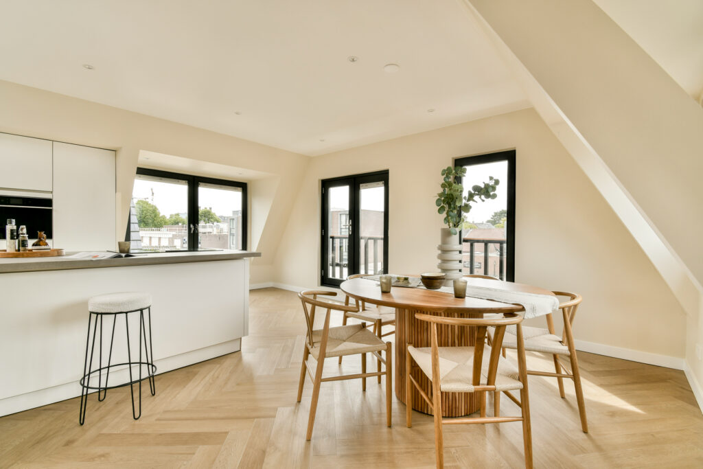 Tweede verdieping: hier bevindt zich de royale woonkamer met open keuken. De moderne eilandkeuken van het Nederlandse merk Tulp is uitgevoerd met een licht beton werkblad en voorzien van een complete set inbouwapparatuur, waaronder een set inbouwapparatuur combi-magnetron, volledig geïntegreerde vaatwasmachine, inductiekookplaat met geïntegreerde afzuiging, koelkast en een Bosch diepvries. Dankzij de open indeling en de raampartijen aan beide zijden is dit een lichte en aangename leefruimte.
