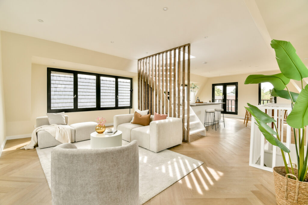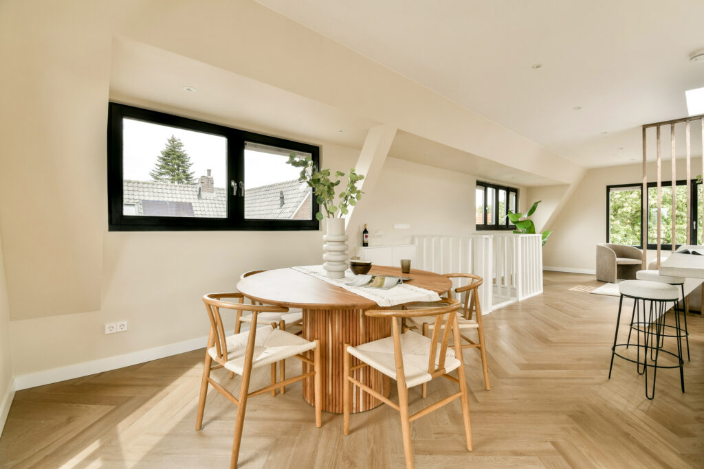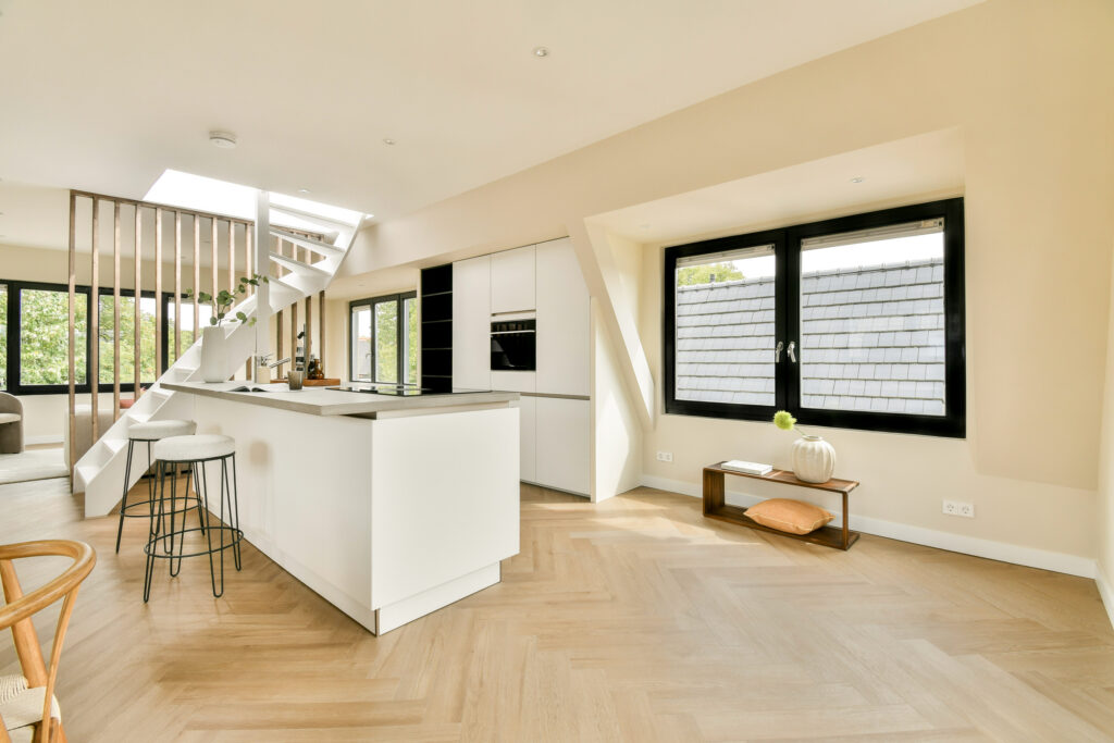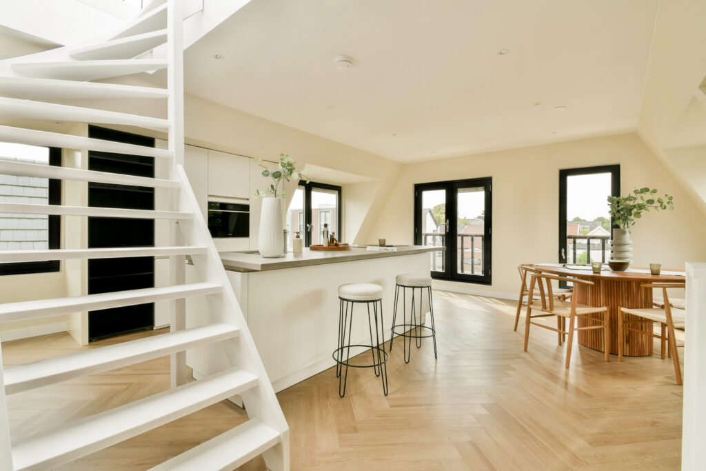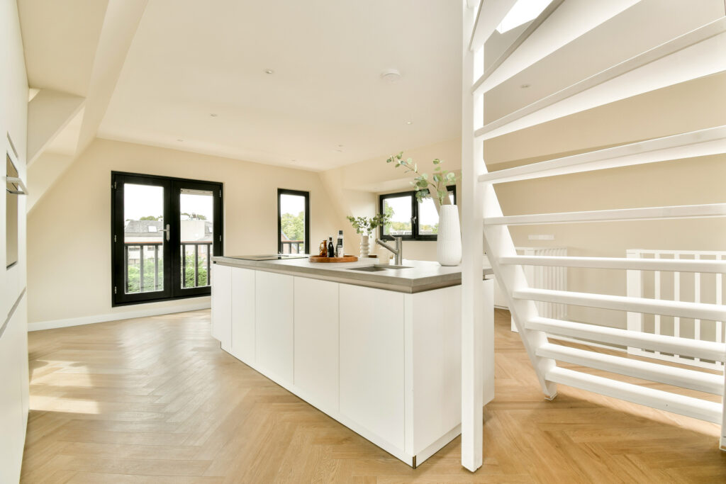 Second floor: spacious living room with open-plan kitchen. The modern island kitchen from Dutch brand Tulp features a light concrete worktop and comes with a full set of built-in appliances, including a combination microwave, fully integrated dishwasher, induction hob with integrated extractor, refrigerator, and Bosch freezer. Thanks to the open layout and windows on both sides, this is a bright and inviting living space.
