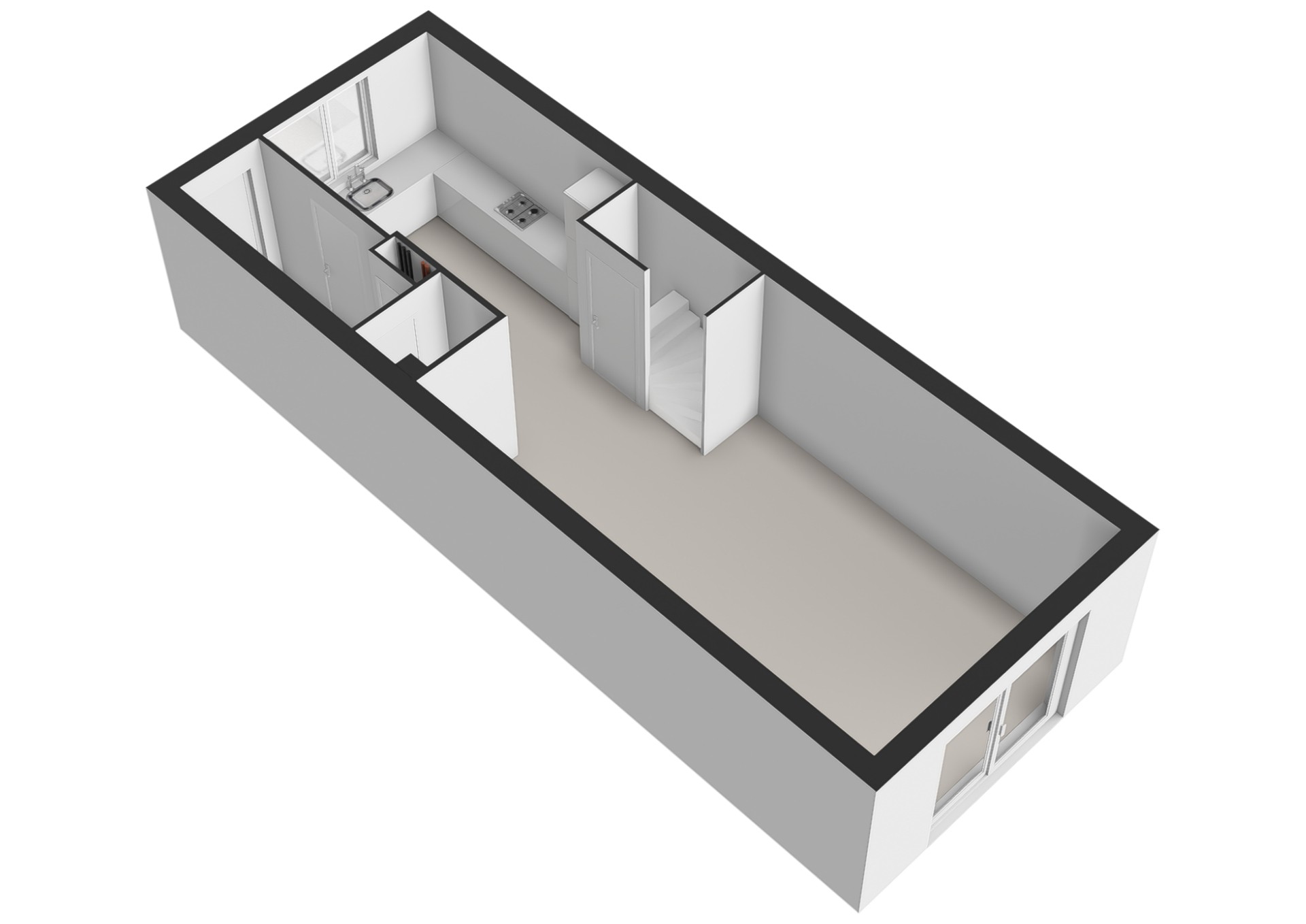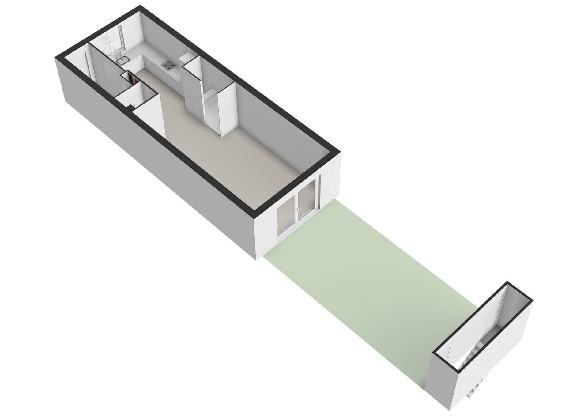 At the front, there’s a bike storage and a cozy garden. Entering through the front door, you find yourself in a spacious hallway with the fuse box and the first toilet. To the left is the kitchen, equipped with a fridge/freezer combination, a 5-burner gas stove with oven, a dishwasher, and an extractor hood. The kitchen flows into the living room, which provides access to the extended and elevated backyard via sliding doors. Under the elevated deck, there’s a spacious storage area.