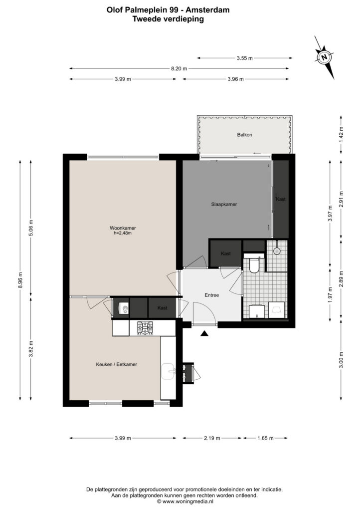 Via het gemeenschappelijke trappenhuis bereik je de woning op de tweede etage. De entree geeft toegang tot alle vertrekken. Aan de voorzijde bevindt zich de ruime woonkamer met veel lichtinval. Vanuit de woonkamer bereik je de ruime open keuken en eetkamer. Deze is praktisch ingedeeld en voorzien van diverse inbouwapparatuur. Aan de achterzijde van de woning ligt de slaapkamer met een grote schuifdeur die directe toegang biedt tot het brede balkon, gelegen op het zuidwesten. De badkamer is in 2022 vernieuwd en voorzien van een toilet, een ruime douche, een wastafel met meubel en een aansluiting voor de wasmachine. Daarnaast beschikt de woning over twee inpandige bergingen, wat zorgt voor extra bergruimte binnen het appartement.