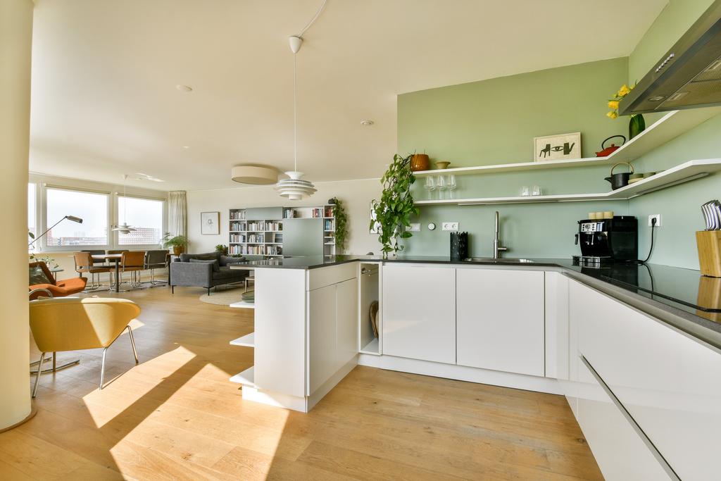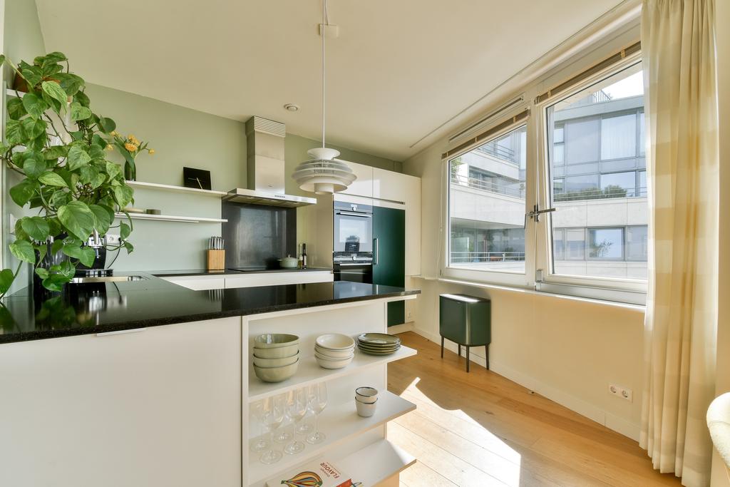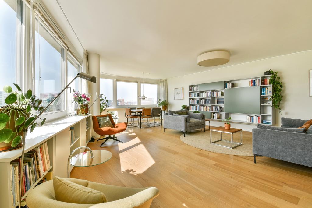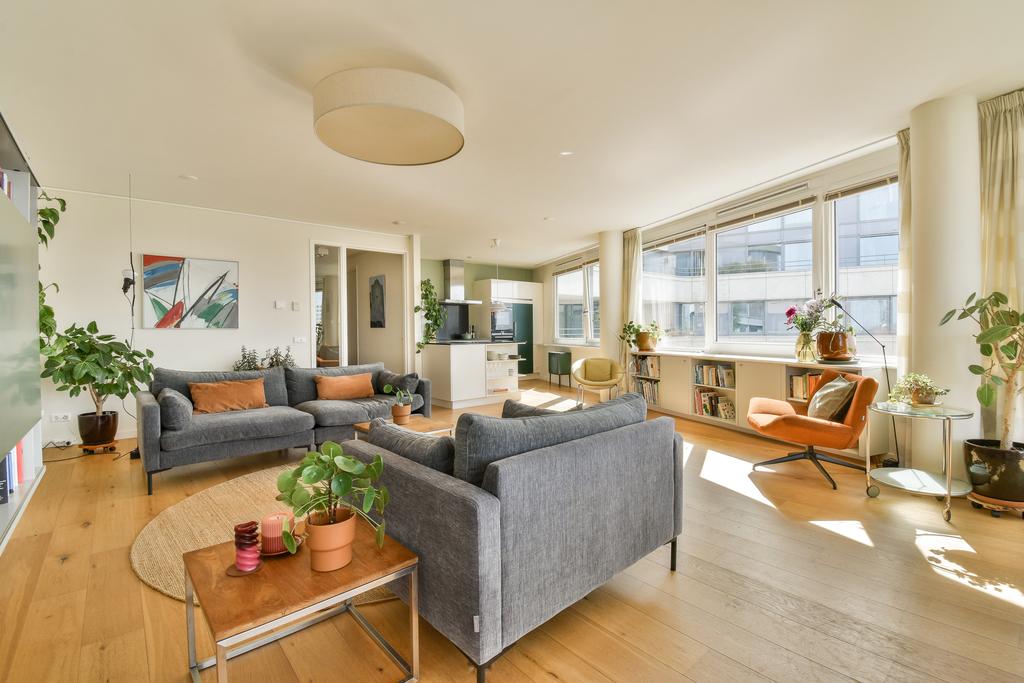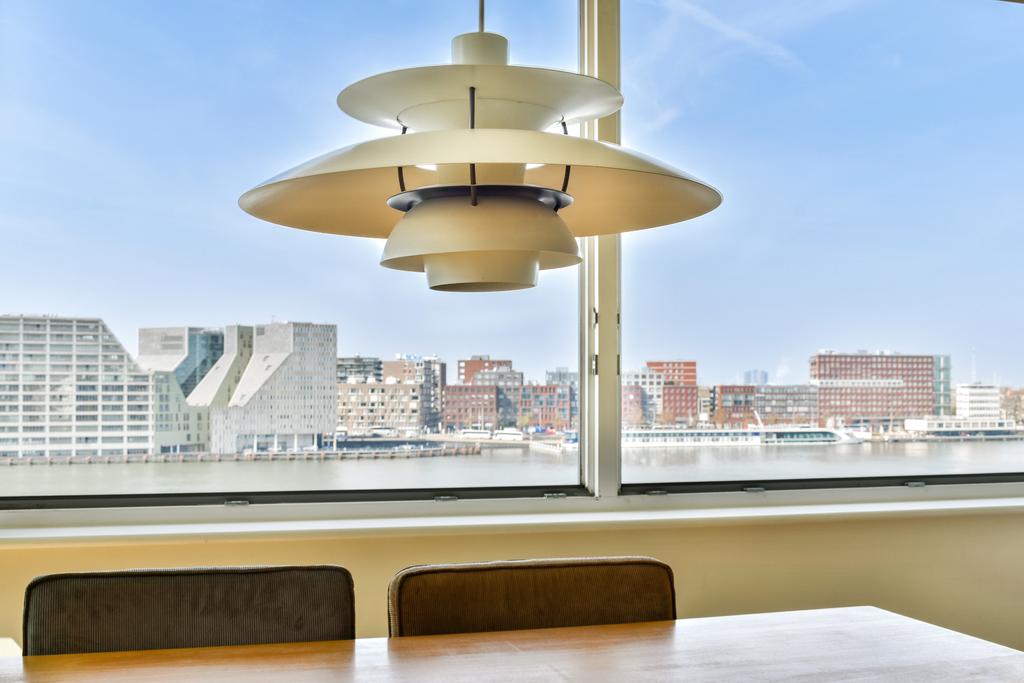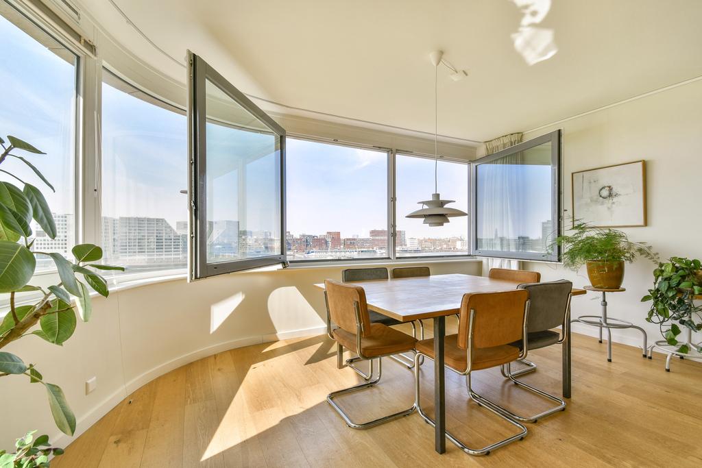 De mooie, lichte living is omgeven door glas en heeft een panoramisch uitzicht over het IJ. De open keuken is het hart van de woning. In 2021 is de keuken deels gerenoveerd en is de volgende apparatuur geplaatst: een inductiekookplaat, stoomoven, combi-oven en een Quooker kraan.