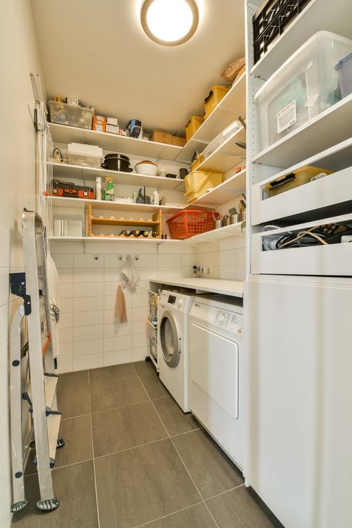 een inpandige berging, een ruime badkamer, een separaat toilet, een wasmachineruimte en twee slaapkamers.