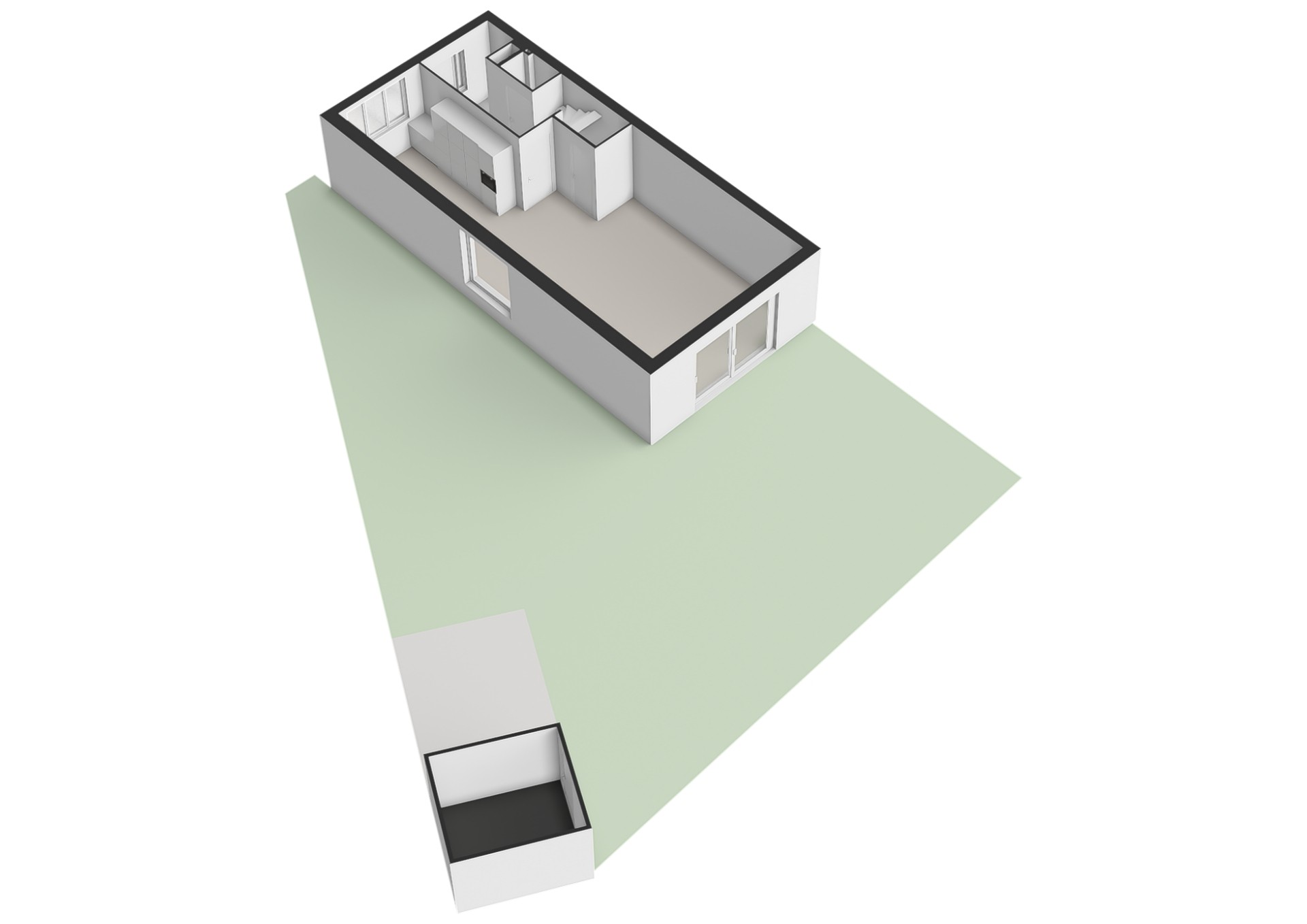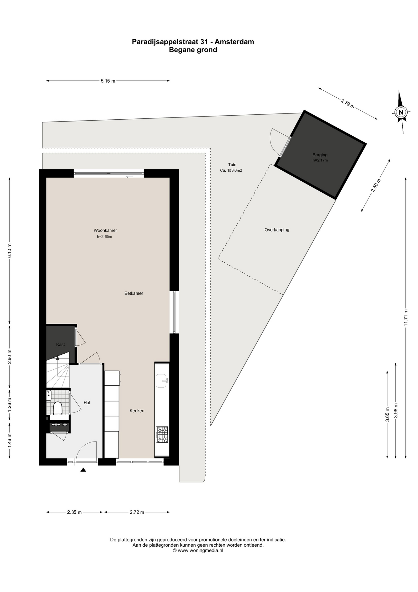 Begane grond: entree, hal, separaat toilet, gang, woonkamer met open keuken en toegang naar de tuin.