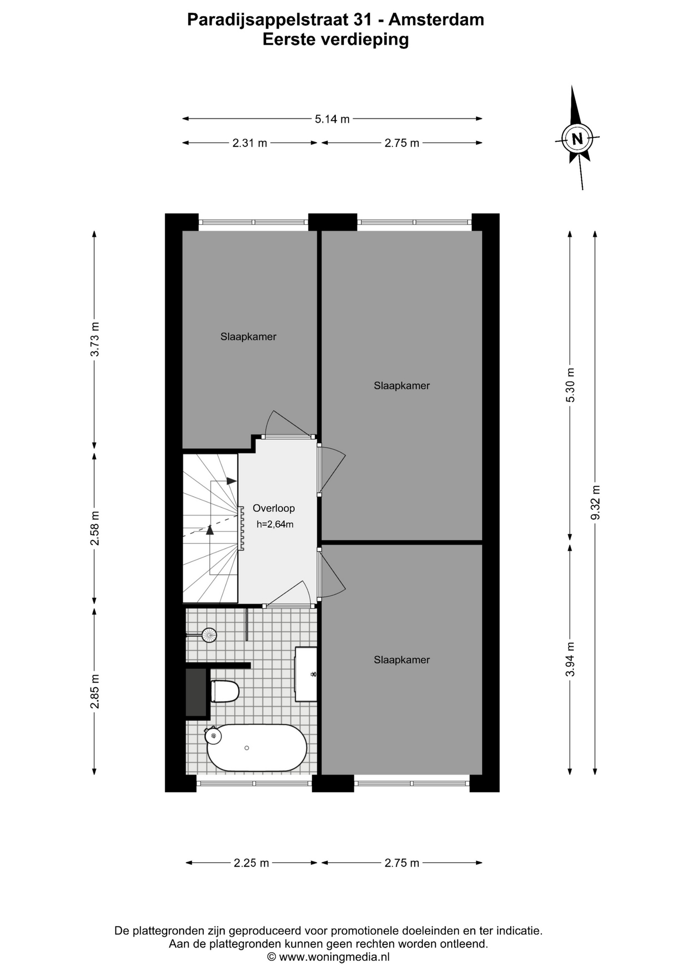 Eerste verdieping: 3 ruime slaapkamers, 2 aan de achterzijde gelegen, 1 aan de voorzijde, nette badkamer met ligbad, wastafel, toilet en inloopdouche.