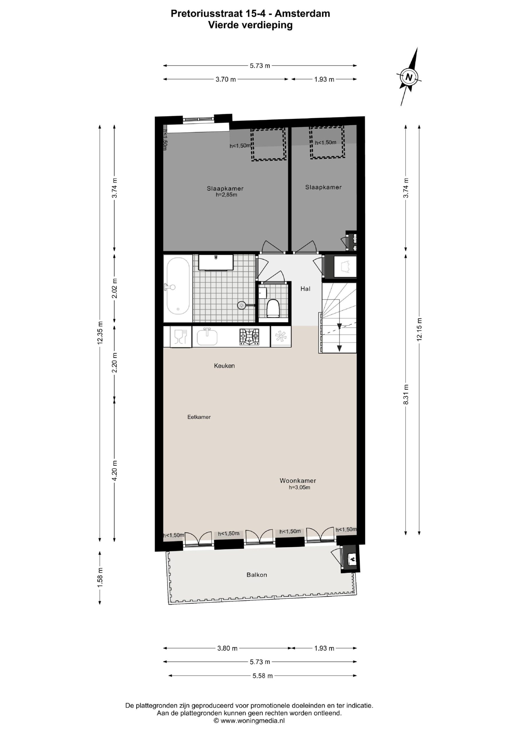 Vierde etage: hoge en lichte woonkamer met open designkeuken voorzien van alle denkbare inbouwapparatuur en mooi vormgegeven details. De gehele woning heeft een bamboe parketvloer. Drie openslaande dubbele deuren naar groot en zonnig balkon op het zuidoosten over de gehele breedte van de woning. In het midden van de woning vind je de moderne en goed uitgeruste badkamer met ligbad en regendouche en een separaat toilet. Aan de voorzijde bevinden zich een tweetal goed bemeten slaapkamers. Er is een wasmachine aansluiting in een ruime kast waar zowel wasmachine als droger in passen.