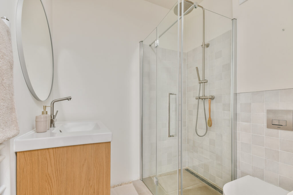 Centraal in de woning bevindt zich de nette badkamer, gerenoveerd in 2024, voorzien van een zwevend toilet, dubbel wastafelmeubel, inloopdouche en handdoekradiator.