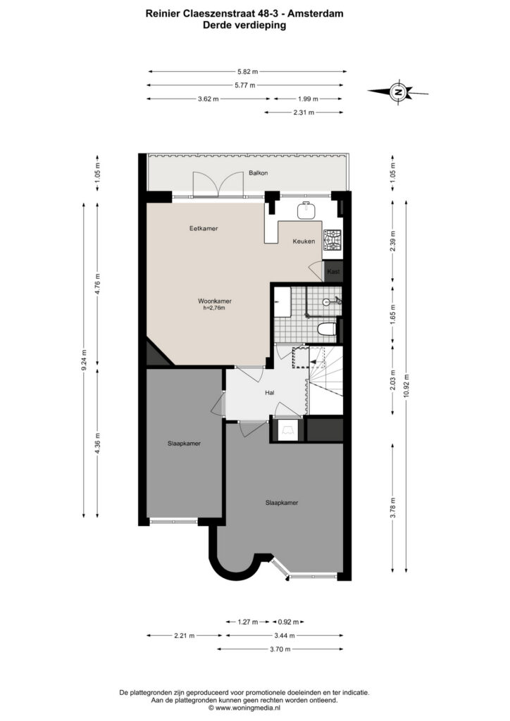 Derde verdieping (bovenste): Binnenkomst in de ruime hal met toegang tot alle vertrekken. Een dakraam zorgt voor veel lichtinval in de hal en de badkamer. De royale woonkamer aan de achterzijde beschikt over openslaande deuren naar een breed en zonnig balkon op het oosten, waar je in de ochtend en het begin van de middag heerlijk van de zon kunt genieten. De woonkamer loopt naadloos over in de moderne, halfopen keuken, voorzien van diverse inbouwapparatuur en met fraai uitzicht op de groene binnentuinen.