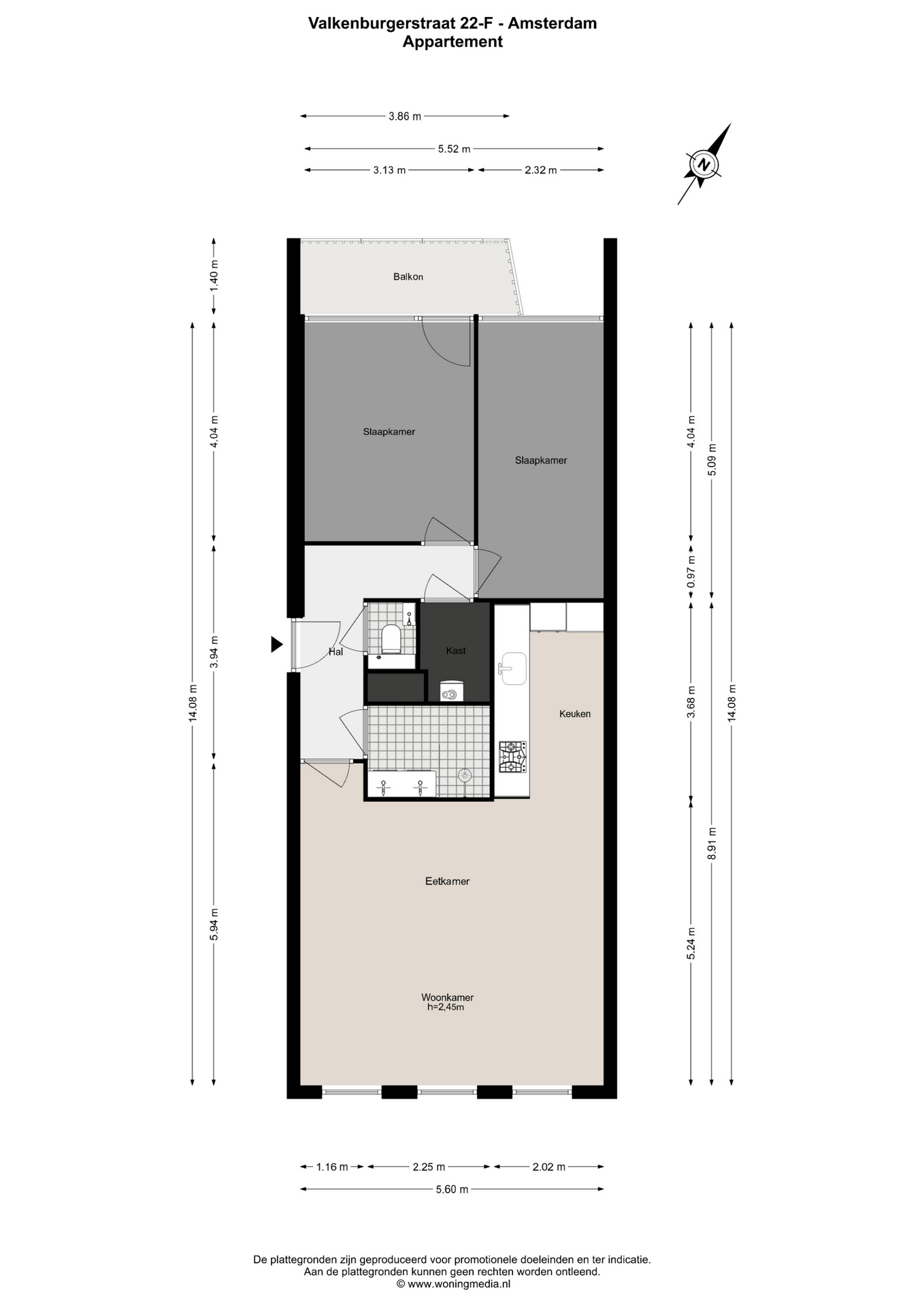Via de entree kom je in de hal die toegang geeft tot alle vertrekken. Aan de voorzijde bevindt zich de ruime en lichte woonkamer met half open keuken. De keuken is praktisch opgesteld en grenst direct aan de eetkamer. In het midden van de woning bevinden zich de badkamer en een separaat toilet. Daarnaast is er een praktische bergkast aanwezig. Aan de achterzijde liggen twee slaapkamers van goed formaat. Vanuit één van de slaapkamers is het balkon toegankelijk, wat zorgt voor een fijne verlenging van de leefruimte. Het balkon is gelegen op het noordwesten met zicht op de binnentuin van het gebouw, waardoor je hier in de middag en avond heerlijk kunt genieten van de zon. Dankzij de gunstige ligging biedt het balkon een prettige combinatie van licht, rust en privacy.