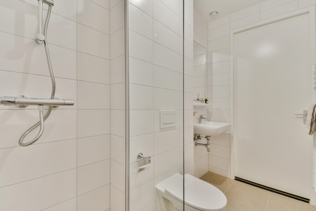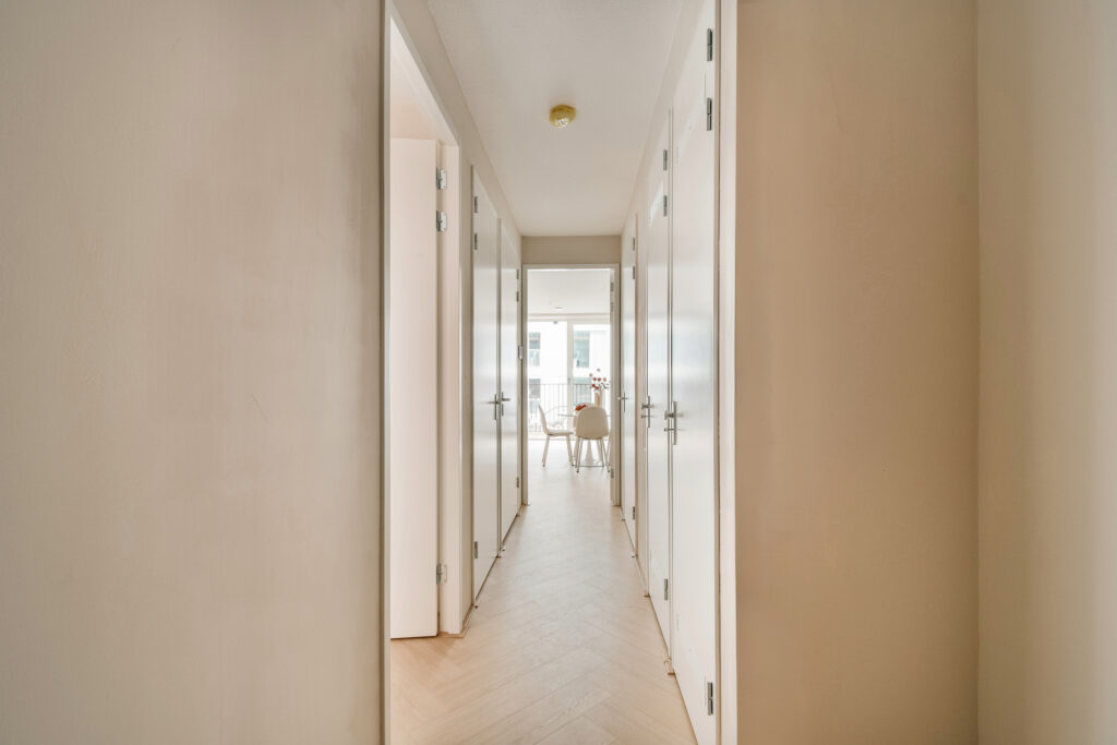 Met de lift of het trappenhuis bereiken we de voordeur. Je betreedt het appartement via de entree in de hal. Vanuit hier heb je toegang tot de verschillende vertrekken in de woning. Aan de voorzijde bevindt zich de slaapkamer. Deze kamer heeft een prettig formaat en beschikt over een nis met ruimte voor een royale inbouwkast. Centraal in de woning ligt de badkamer, voorzien van een inloopdouche, wastafel en toilet. Daarnaast beschikt de woning over praktische vaste inbouwkasten voor extra bergruimte en de wasmachine.