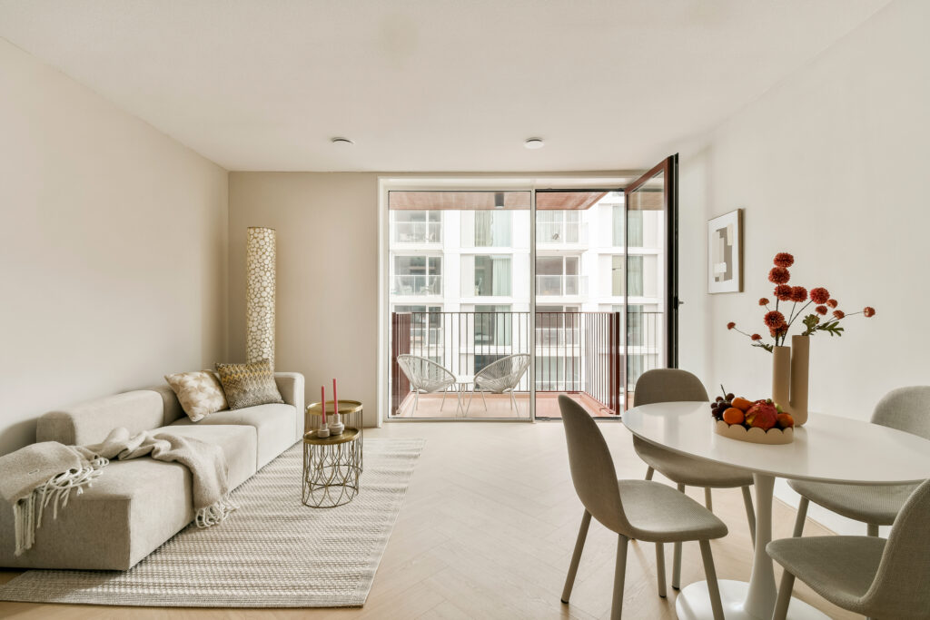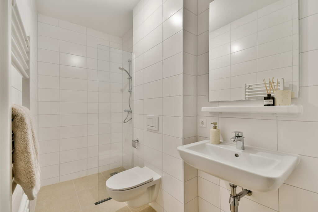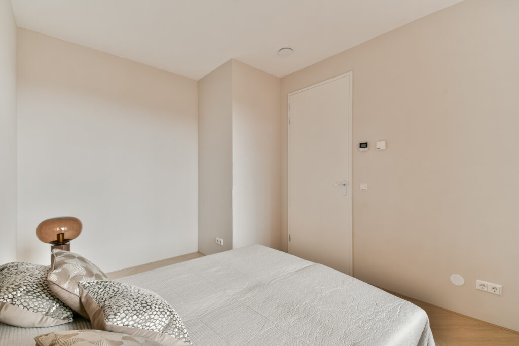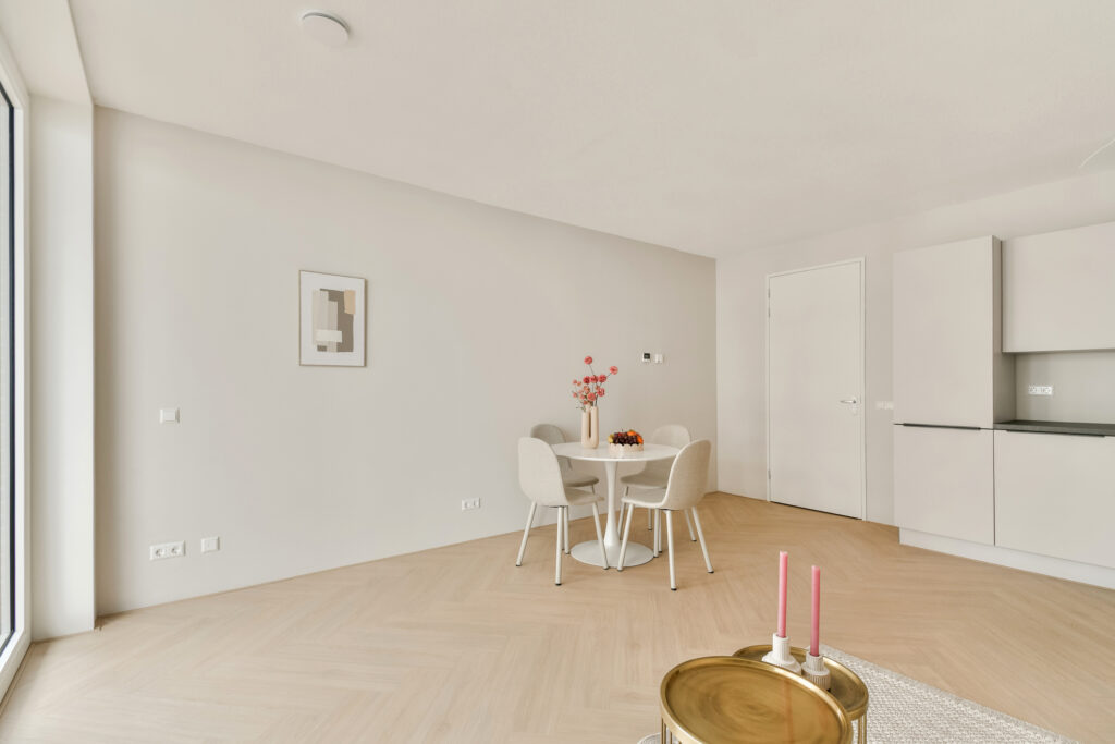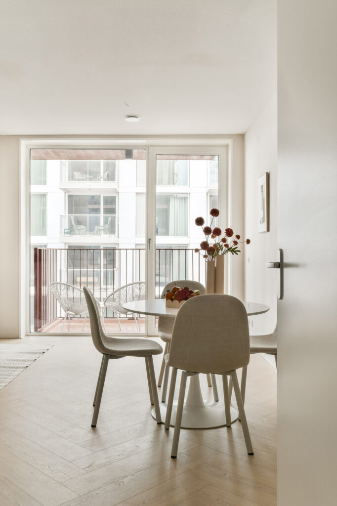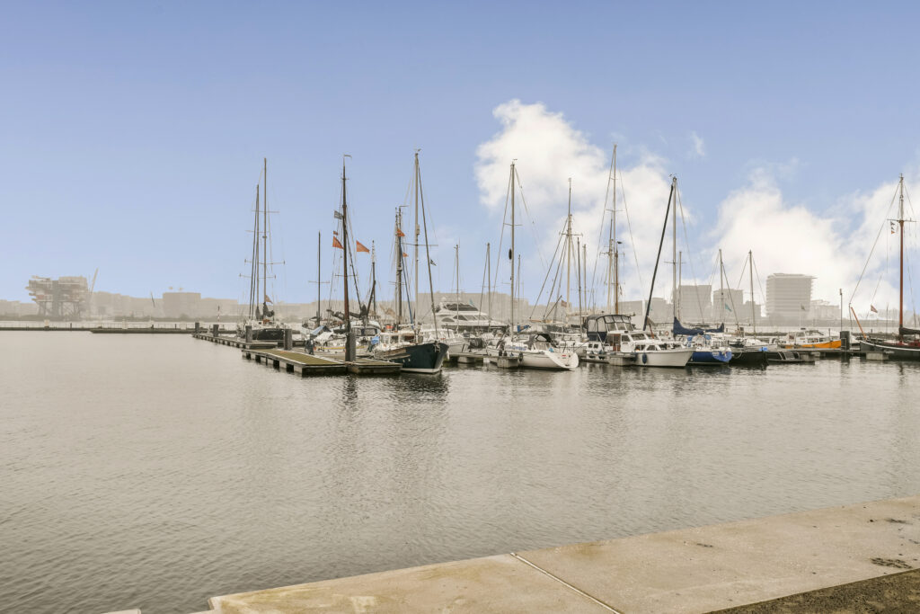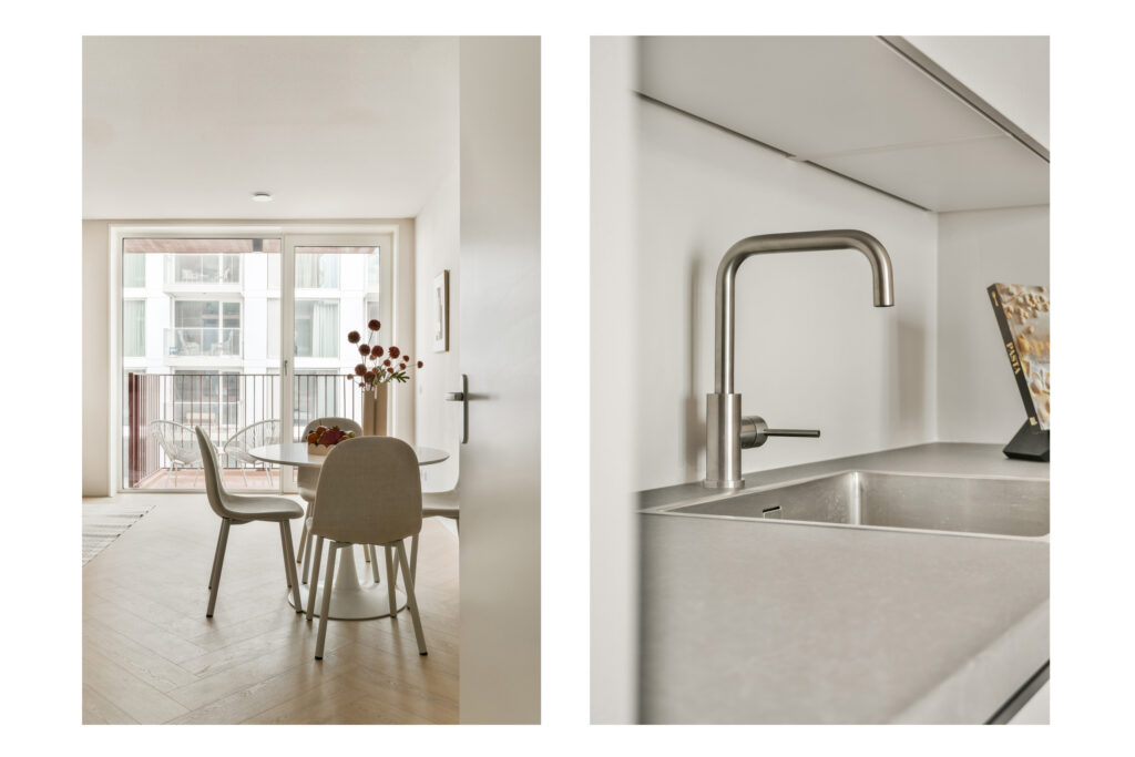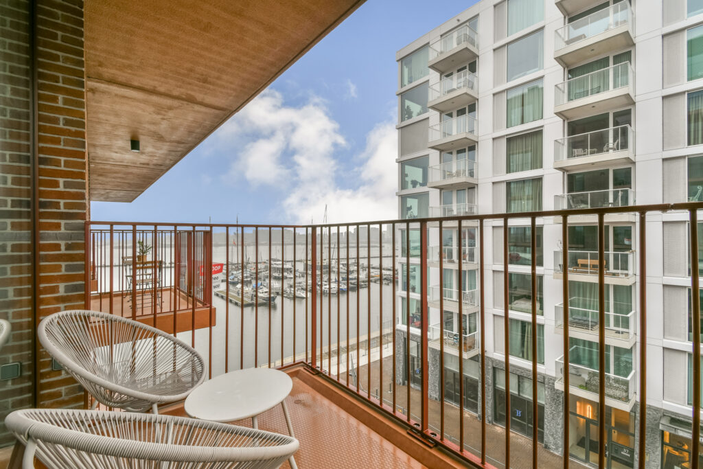 At the rear is the spacious living room with open kitchen. The living room provides ample space for a comfortable seating area and dining area. Thanks to the large windows, you can enjoy plenty of natural light throughout the year. The kitchen dates from 2025 and is fitted with modern built-in appliances. From the living room you have access to the balcony at the rear of the property, offering fantastic views over the harbor and the IJ, perfect for summer days.