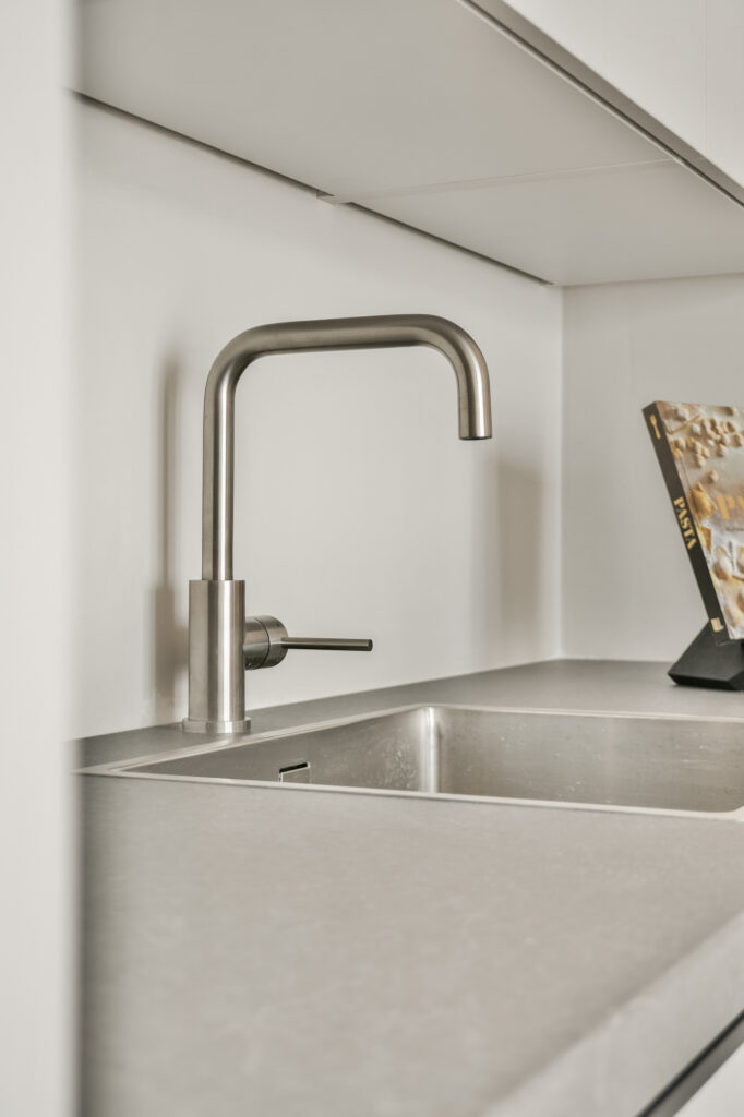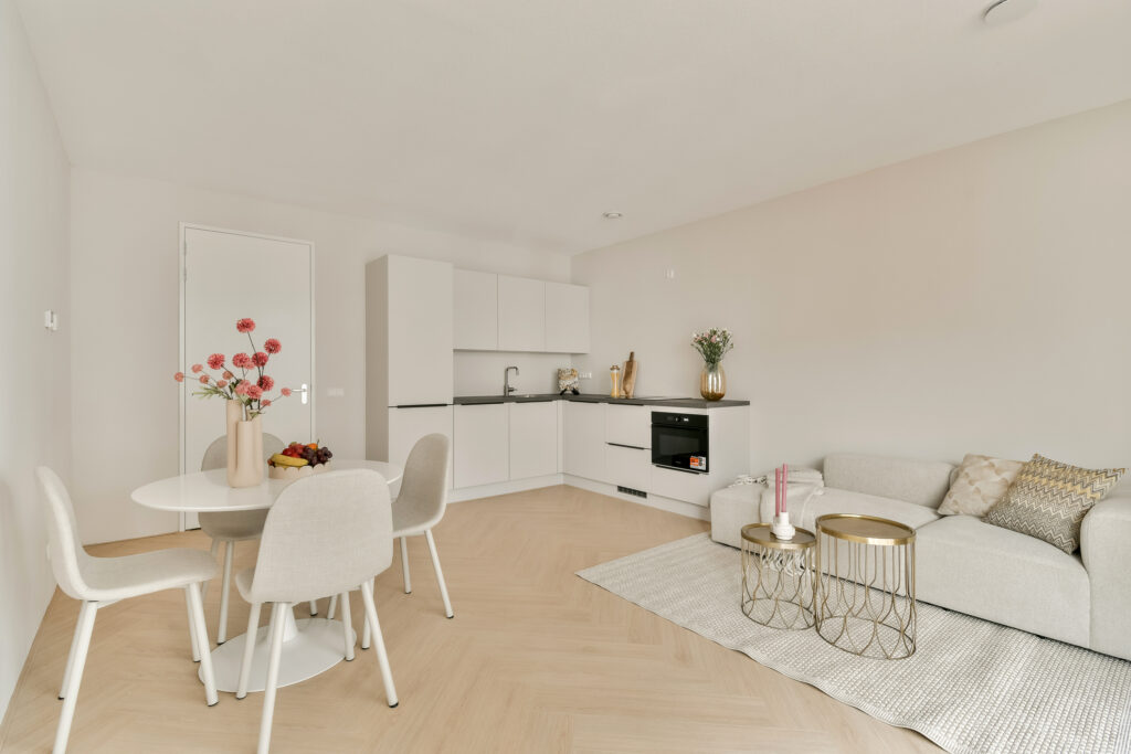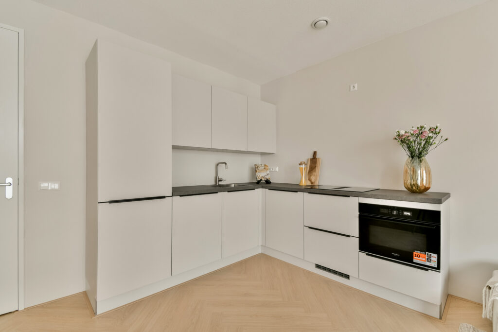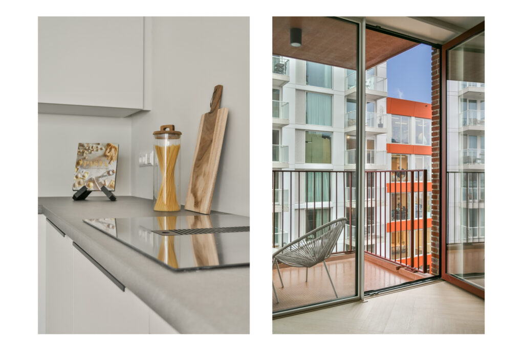 Aan de achterzijde bevindt zich de ruime woonkamer met open keuken. De woonkamer biedt voldoende ruimte voor een comfortabele zithoek en een eethoek. Door de grote ramen geniet je hier het hele jaar door van veel licht. De keuken dateert uit 2025 en is uitgerust met moderne inbouwapparatuur. Via de woonkamer heb je toegang tot het balkon, gelegen aan de achterzijde van de woning, met fantastisch uitzicht op de haven en het IJ. Perfect voor de zomerdagen.