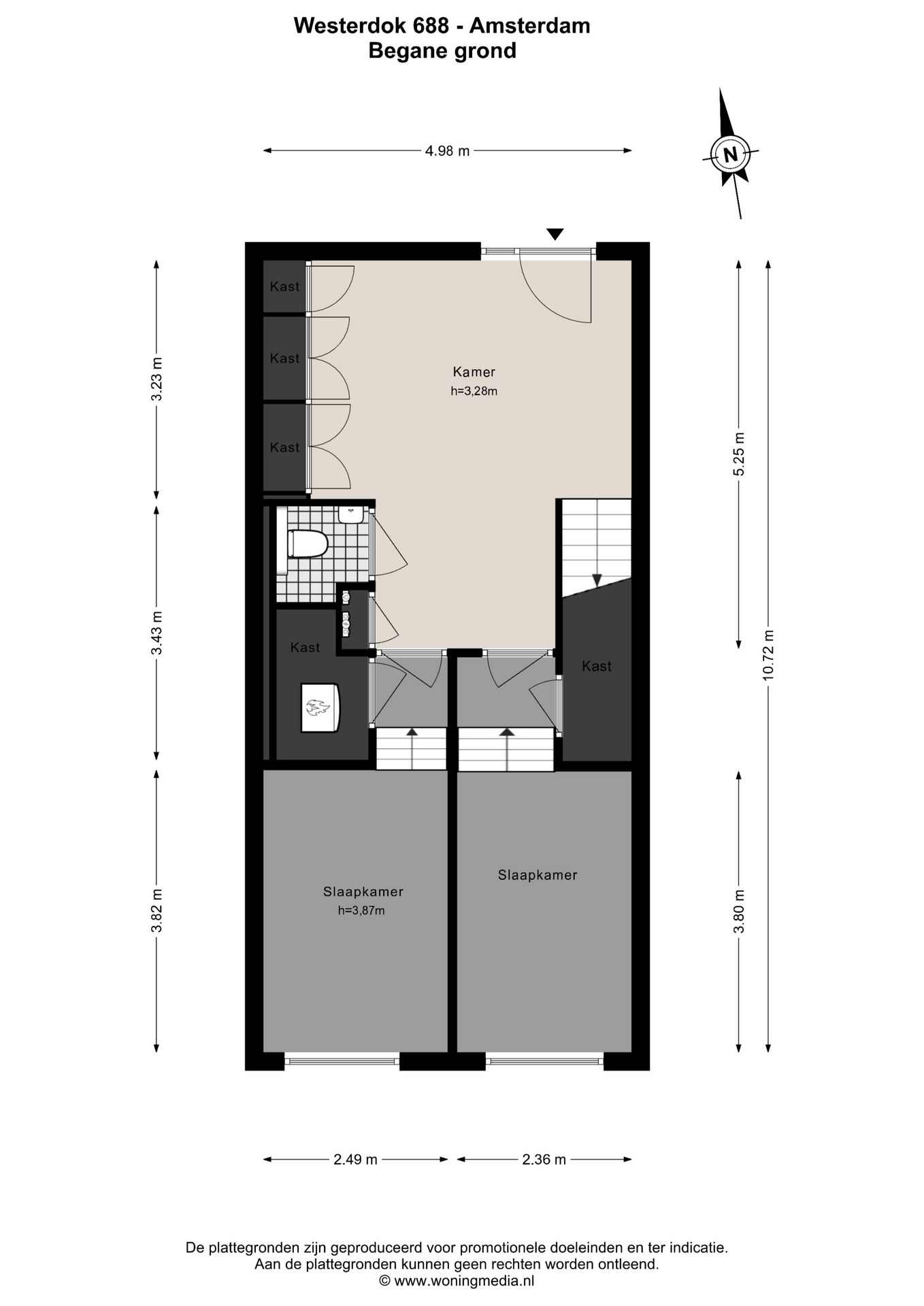 Begane grond: eigen entree vanaf de binnentuin. Binnenkomst in de ruime hal met een praktische, plafondhoge inbouwkast en toegang tot de meterkast, technische ruimte en toilet. Aan de achterzijde van de woning bevinden zich door de split level indeling twee kamers met een plafondhoogte van maar liefst 3,87 meter. Een van de kamers beschikt over een eigen entree vanaf de Leliëndaalstraat.