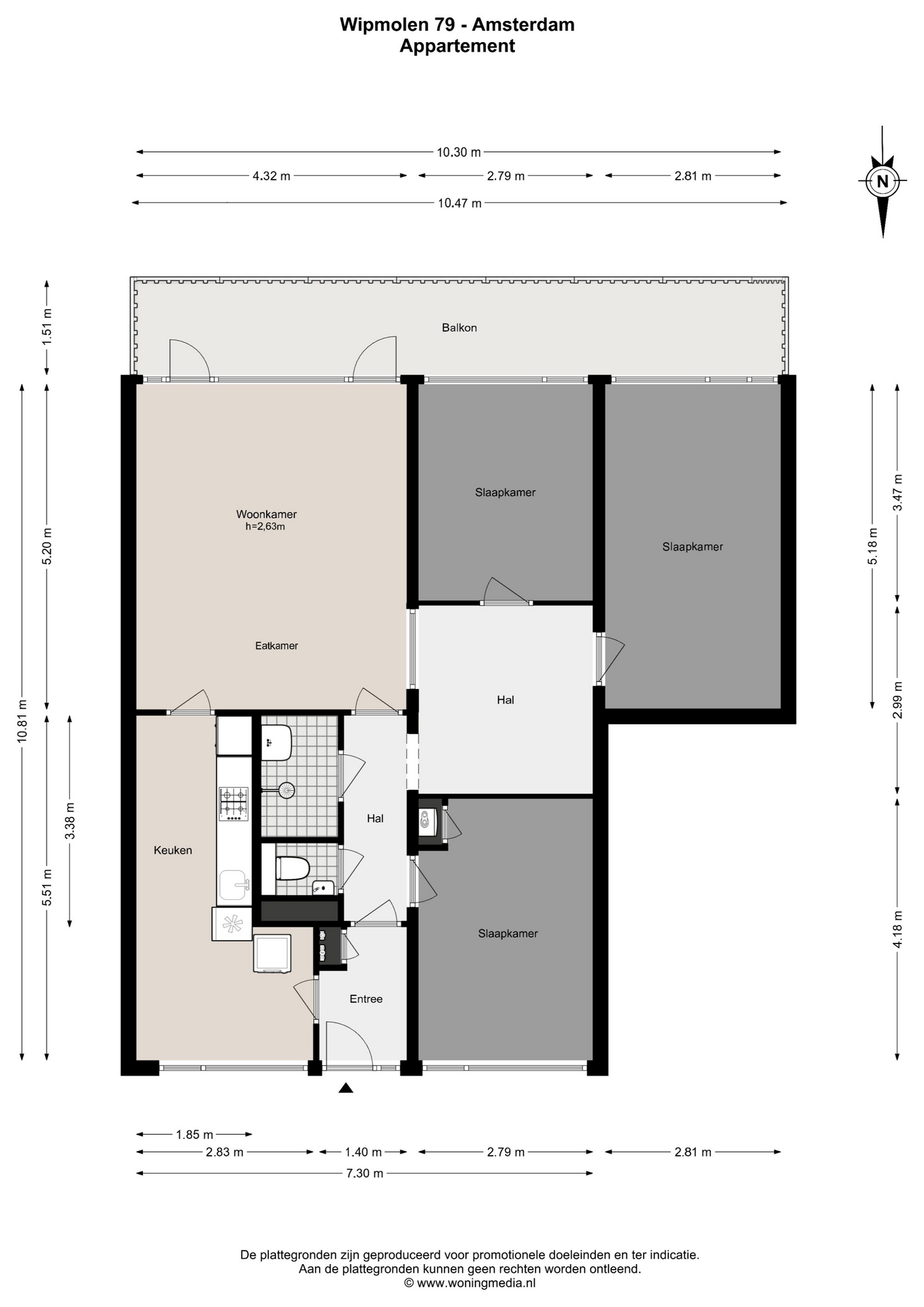De drie slaapkamers zijn allemaal erg ruim. De master bedroom en de tweede slaapkamer grenzen direct aan het balkon. Vanuit de hal waaraan beide slaapkamers liggen, is ook ruimte voor een groot bureau of kastopstelling. De keurige badkamer is voorzien van een douche en wastafelmeubel.