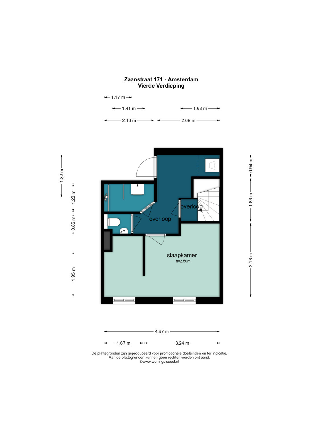 4e Verdieping: Overloop, toilet, badkamer met wastafel en douche. Ruime slaapkamer aan de voorzijde en zeer royale inpandige berging aan de achterzijde.